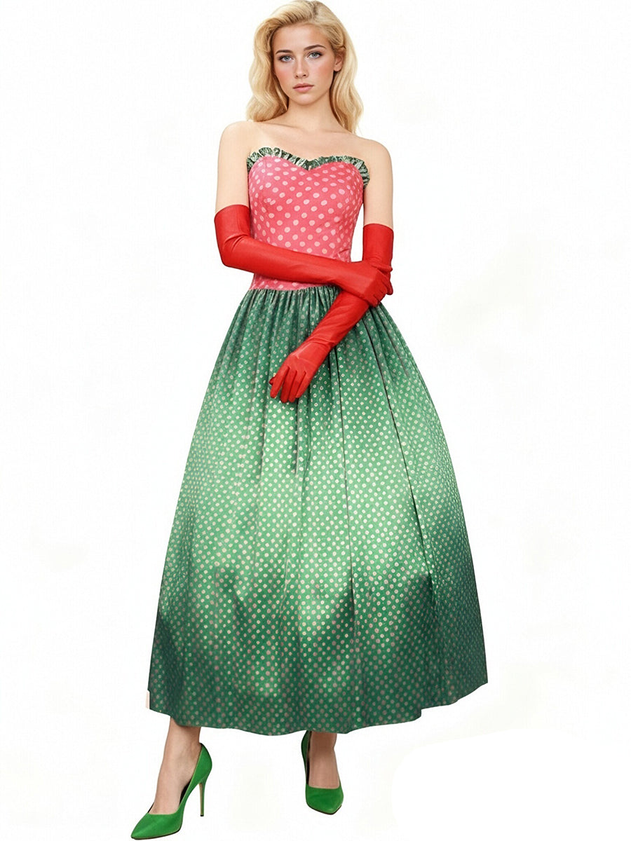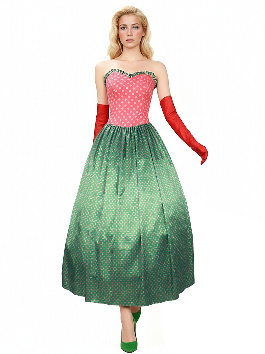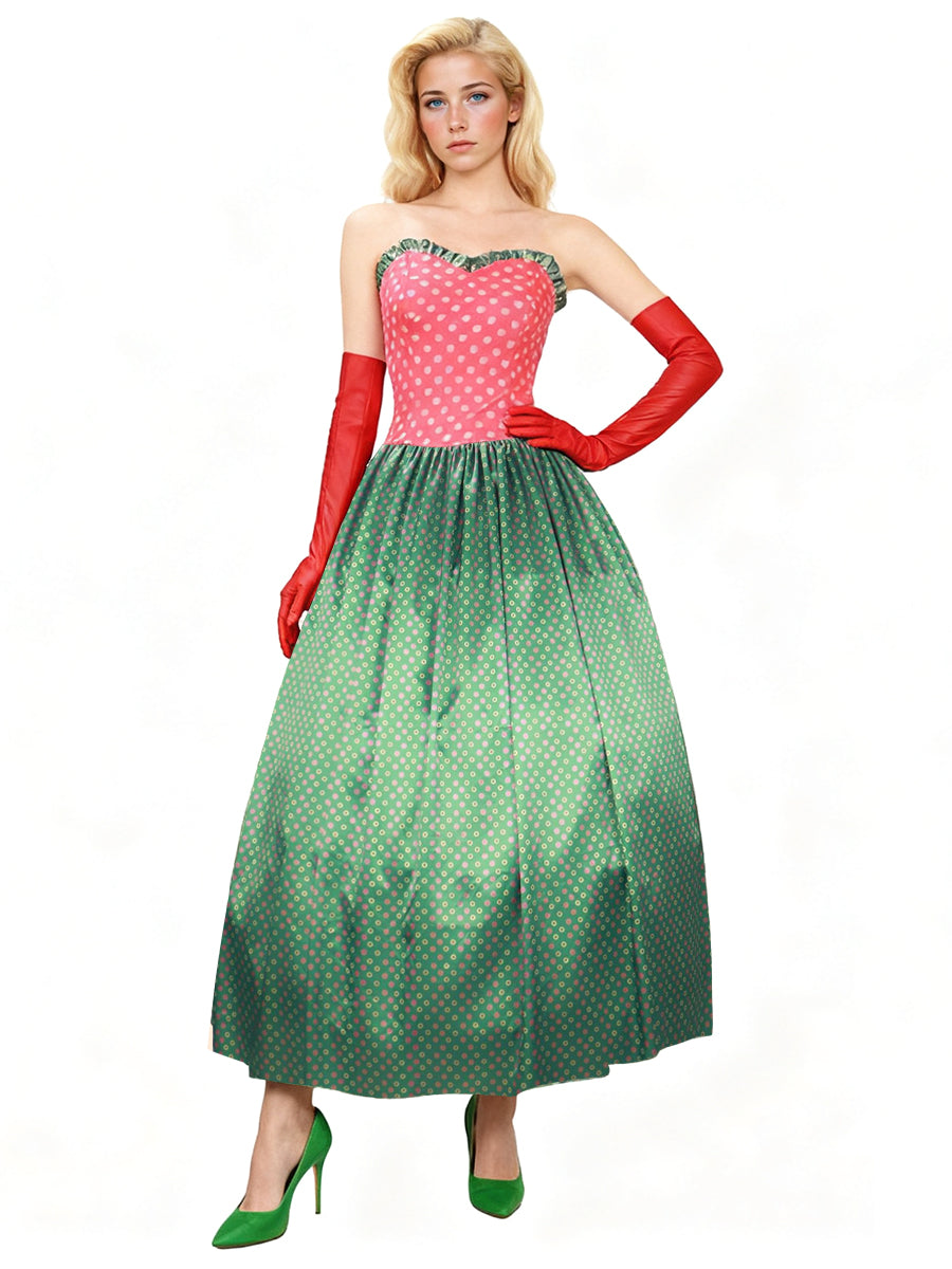 Design: Anime Martha May Christmas Dress: This strapless maxi dress features a long green skirt with attached corset style pink top, and an allover polka dot print, Bring holiday cheer to your wardrobe with this classic character dress.