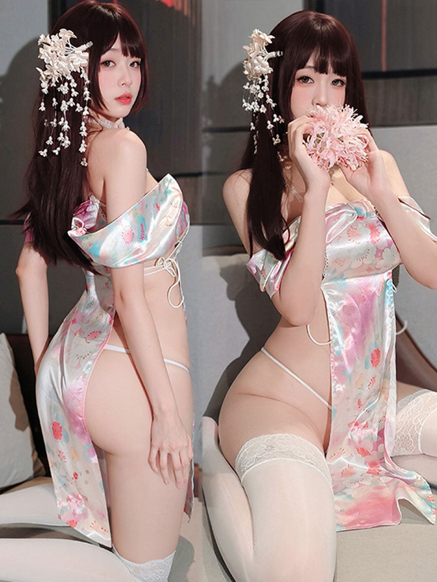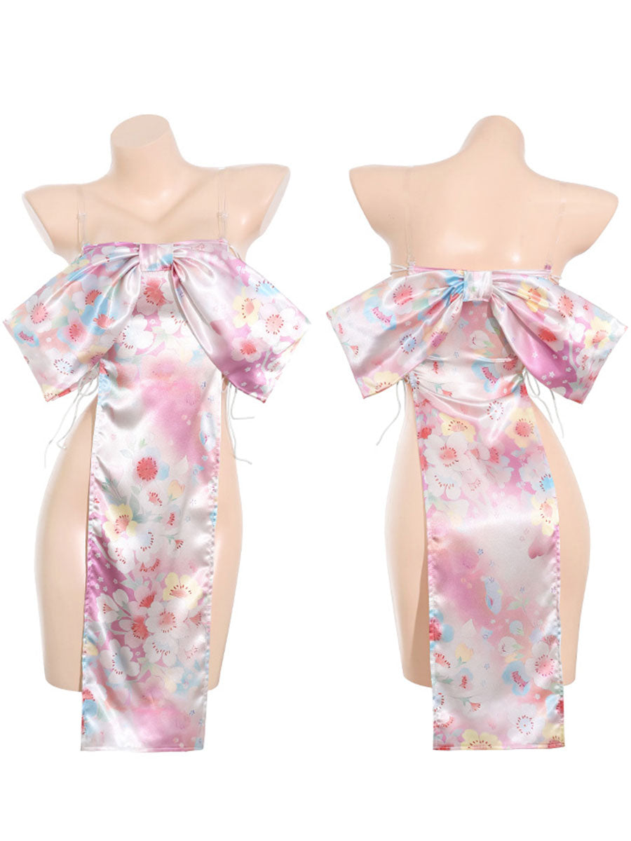 Design: Yomorio kimono lingerie dress featuring a glossy floral print, the off shoulder sleeves, and a draping skirt with high slit hemline, the lace-up closure on the sides offers an adjustable fit for ultimate comfort.