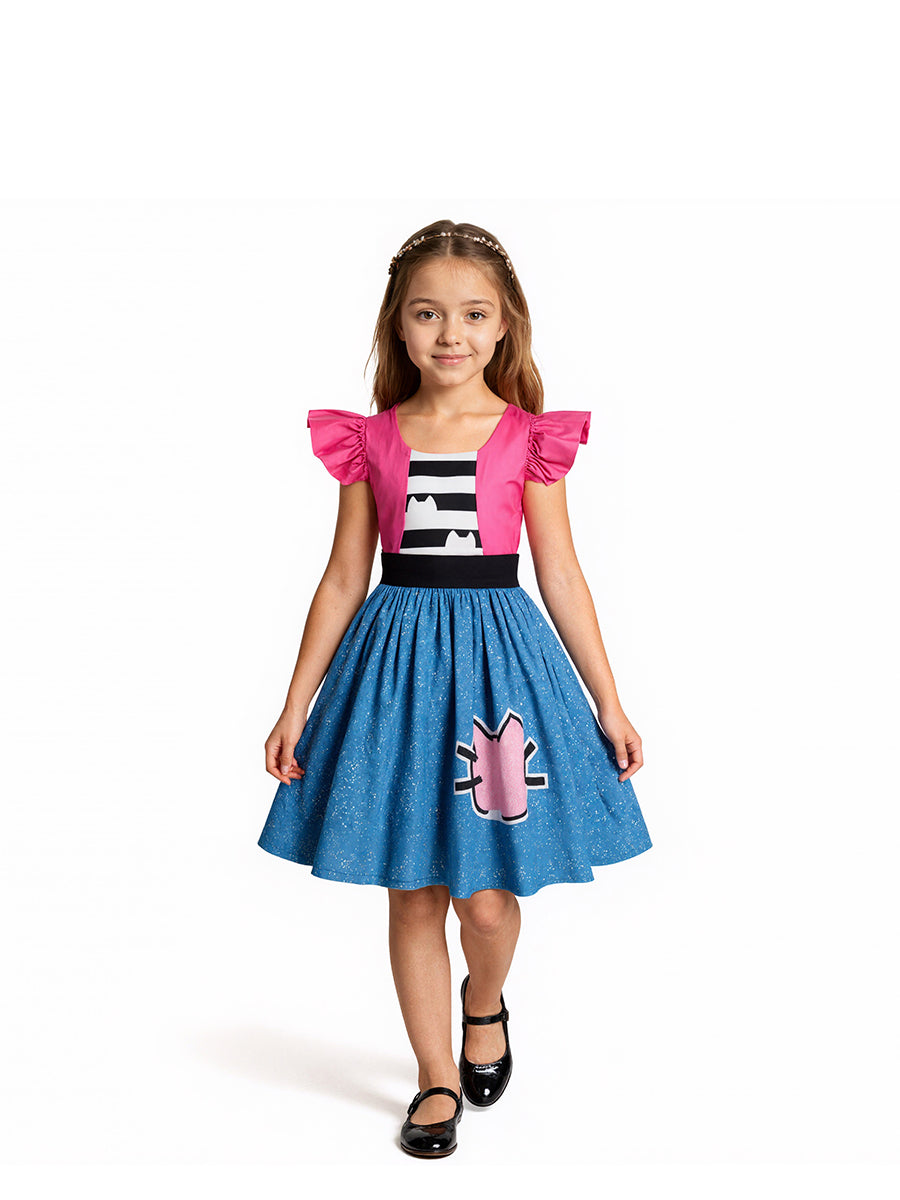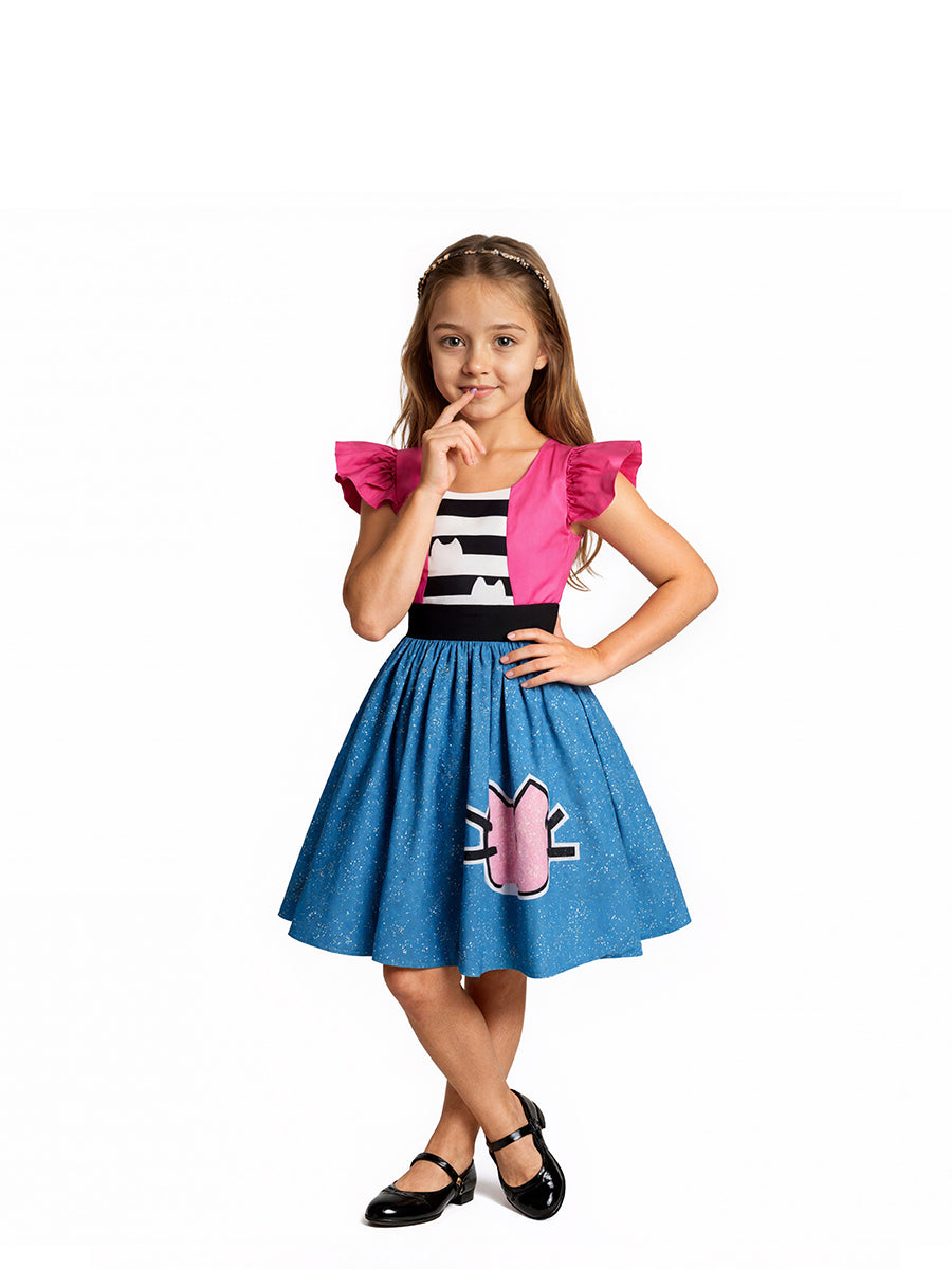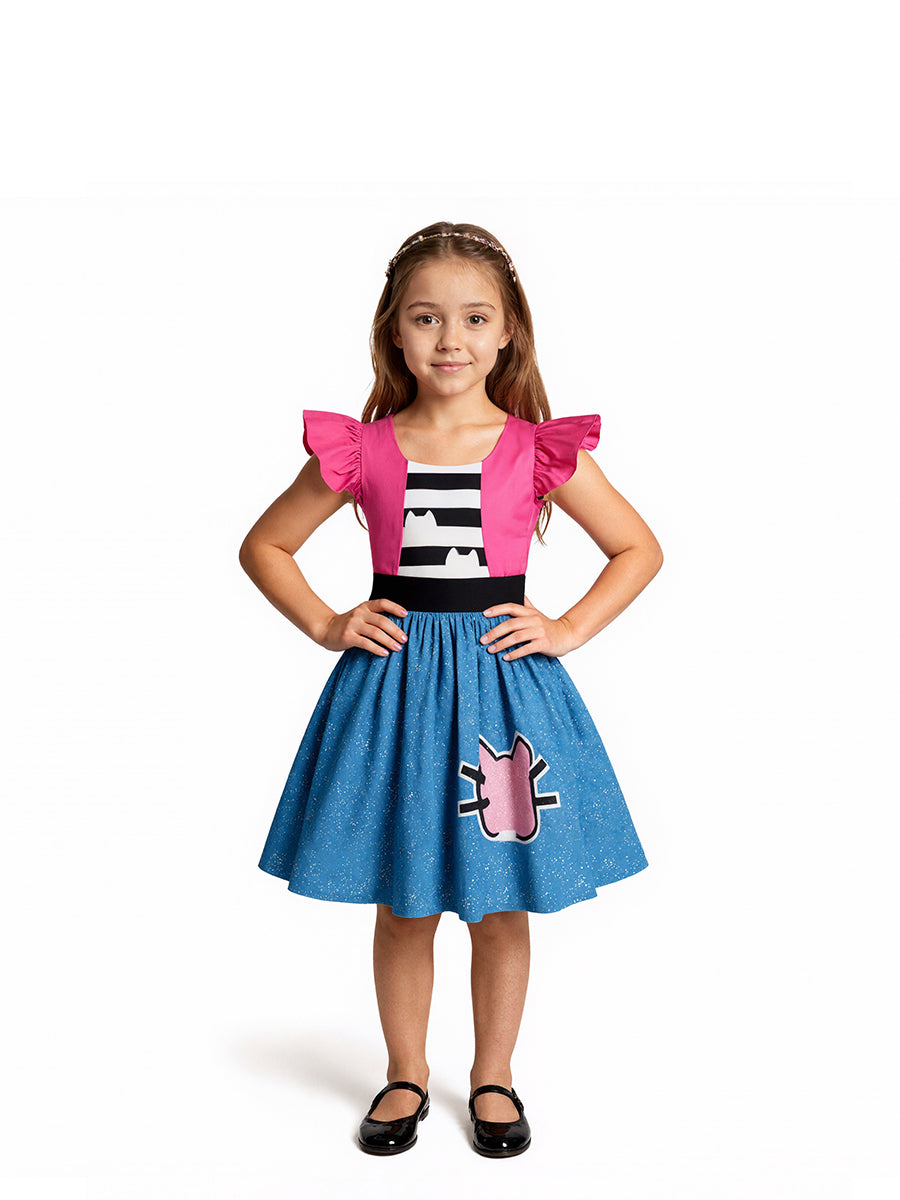 Design: Kids Cat Ear Dress Costume featuring a charming design with bright pink puff sleeves, a black-and-white striped bodice with cat-ear accents, and a full blue skirt sprinkled with white specks, highlighted by a cute pink cat face detail. The bold color contrast of pink, blue, and black creates a cheerful and eye-catching look. Made from lightweight, breathable fabric, this dress allows kids to move freely and enjoy all-day comfort while staying stylish.