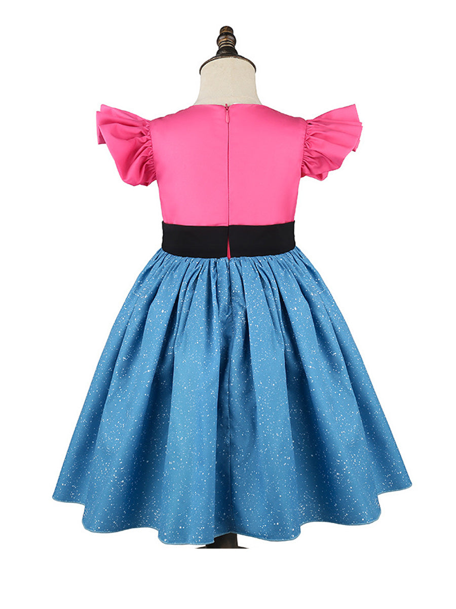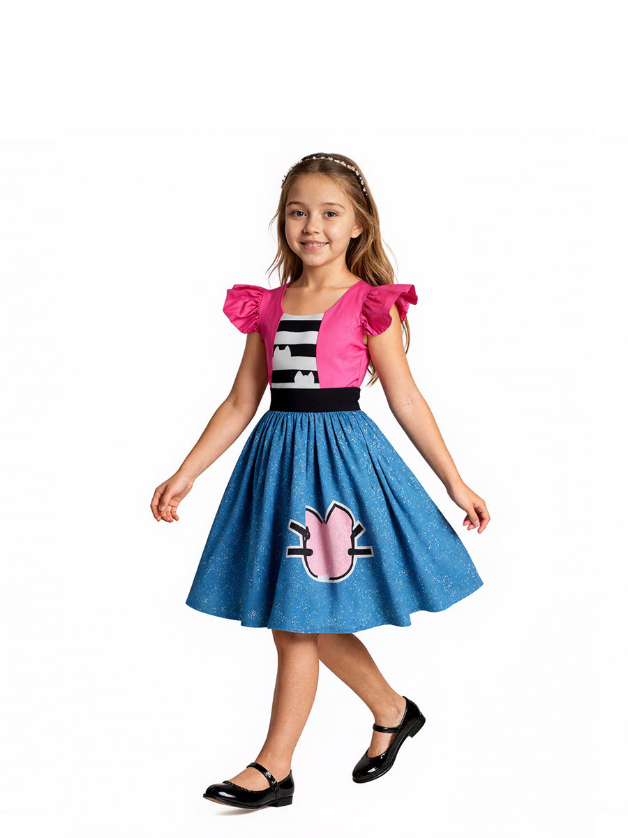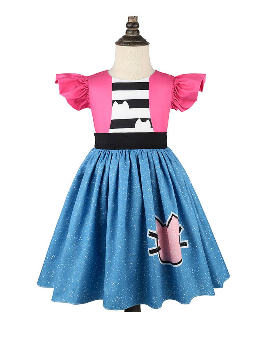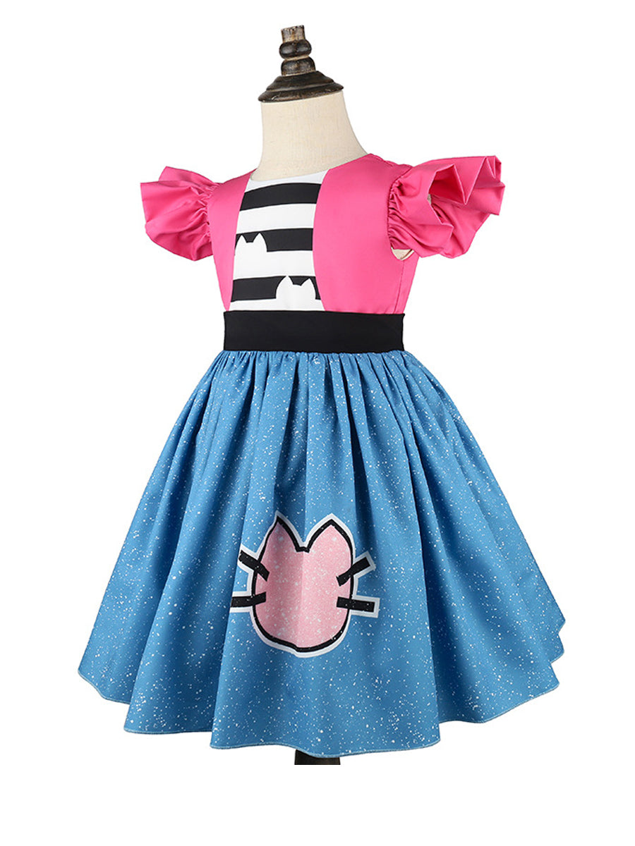 Design: Kids Cat Ear Dress Costume featuring a charming design with bright pink puff sleeves, a black-and-white striped bodice with cat-ear accents, and a full blue skirt sprinkled with white specks, highlighted by a cute pink cat face detail. The bold color contrast of pink, blue, and black creates a cheerful and eye-catching look. Made from lightweight, breathable fabric, this dress allows kids to move freely and enjoy all-day comfort while staying stylish.