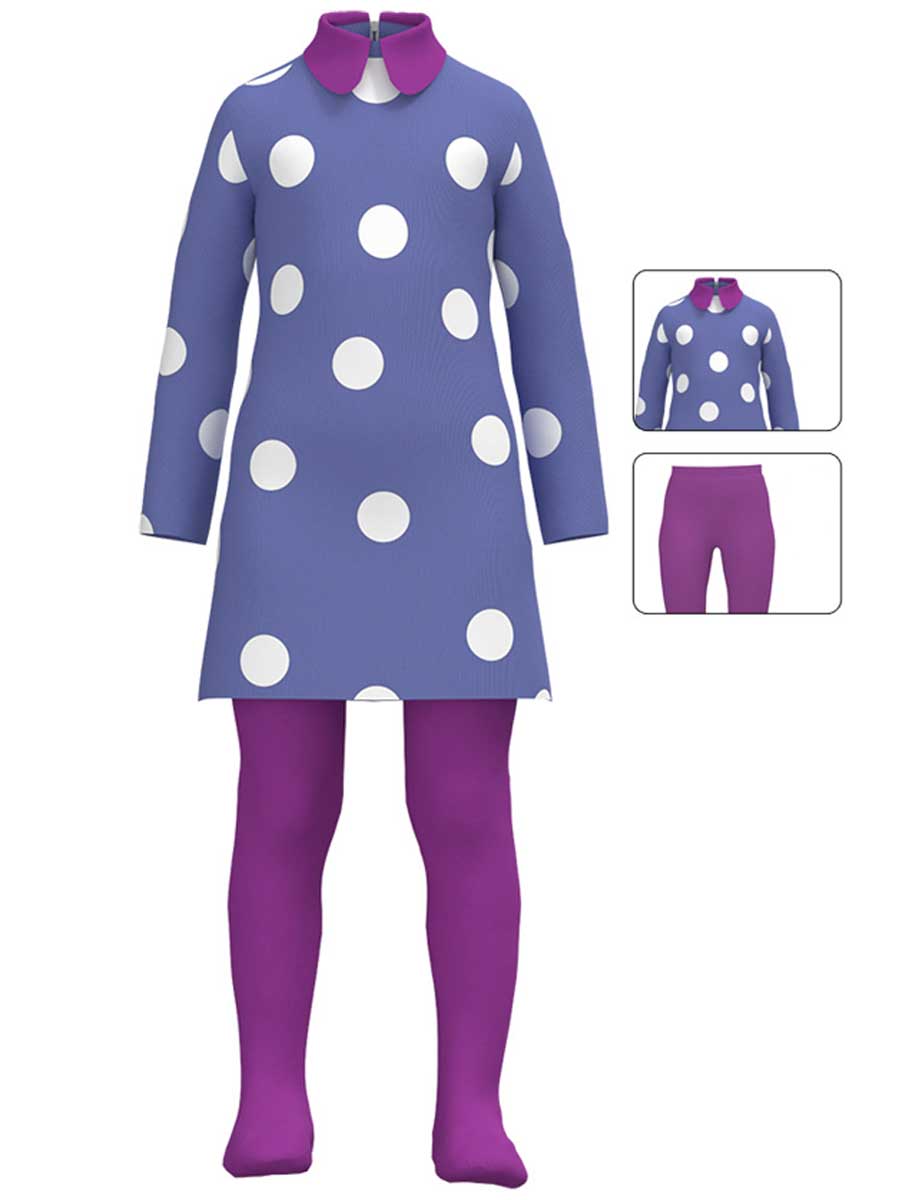 Design: Anime Emotion Cosplay Costume featuring a purple longline top with lapel neckline, an allover polka dots print, back zipper up closure, and matching pantyhose, This Envy costume for animated movie is perfect for showing off your favorite emotion and character!