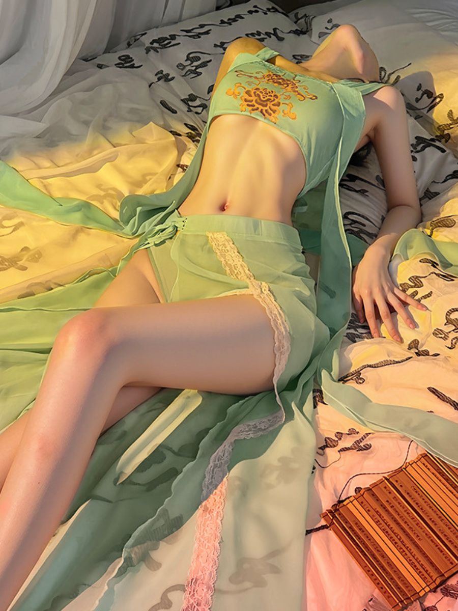 Design: Retro Chinese style costume featuring bandeau-style crop top with wide straps, front golden floral print, and a draping green skirt with high slits, draping gold leaf accents, and a matching panty.