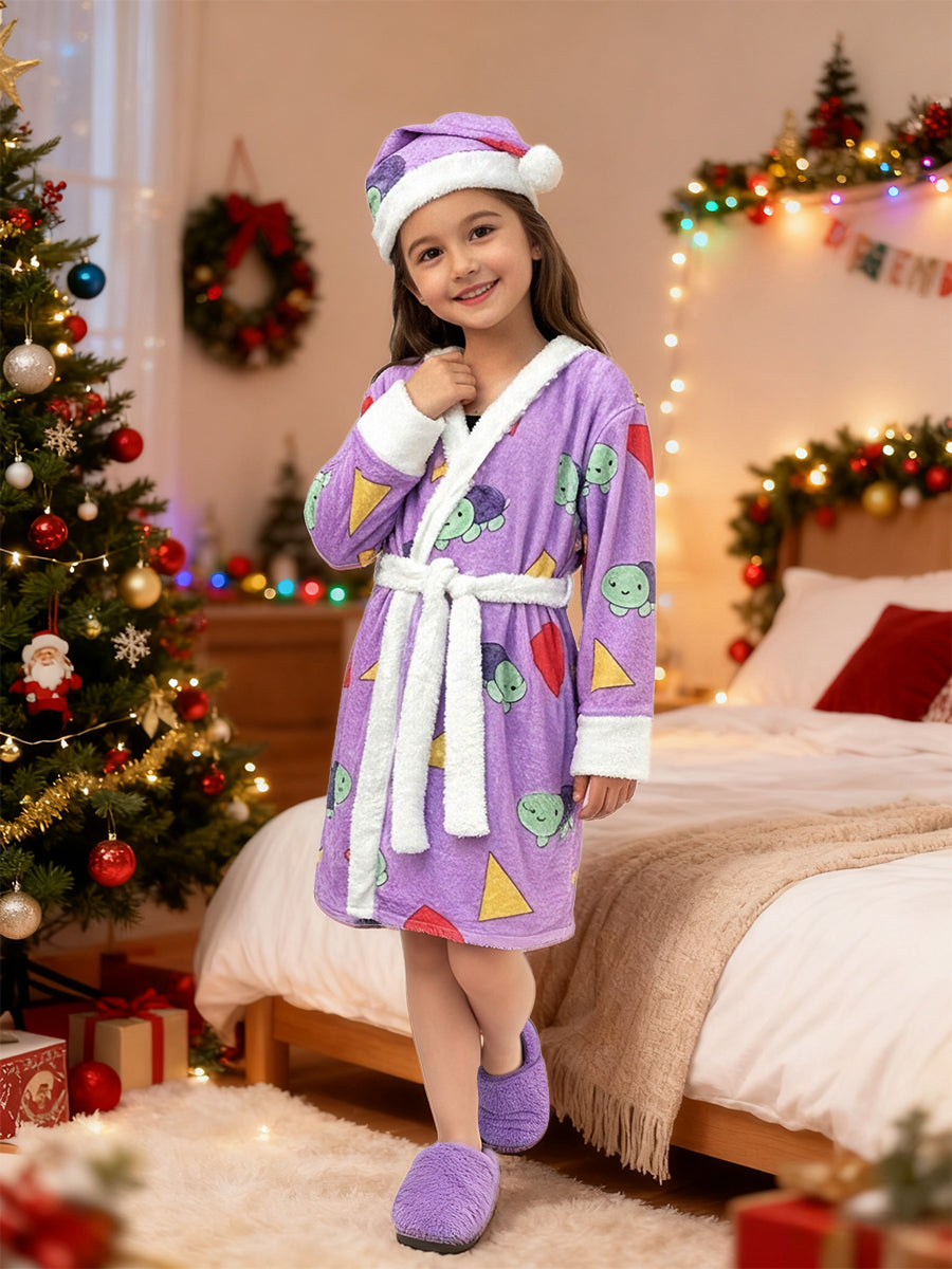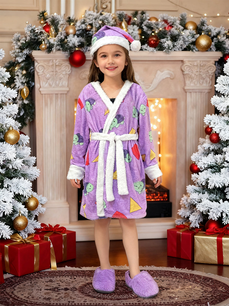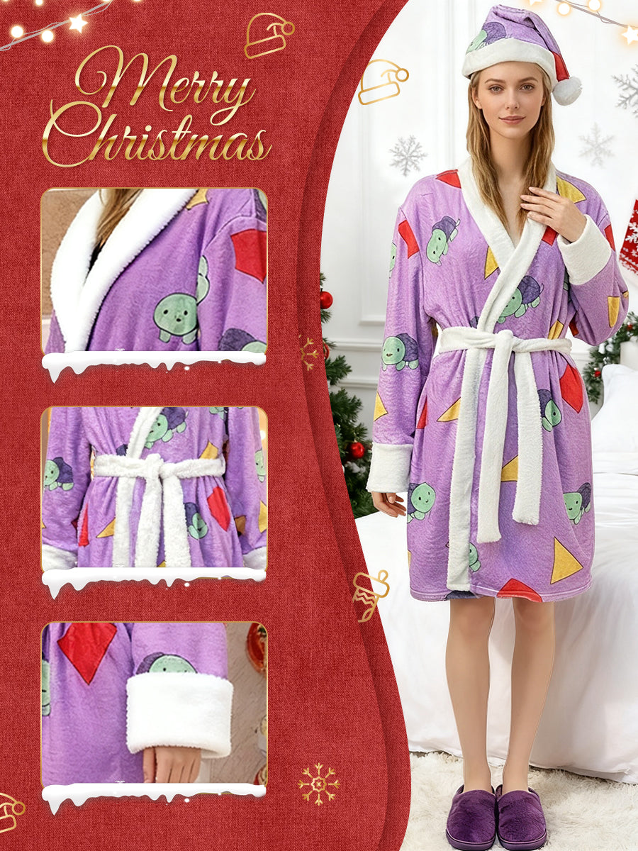 Design: Anime Christmas Plush Robe Set featuring a soft fleece robe adorned with cute turtle prints and colorful geometric shapes, paired with a matching Santa hat for a festive touch.