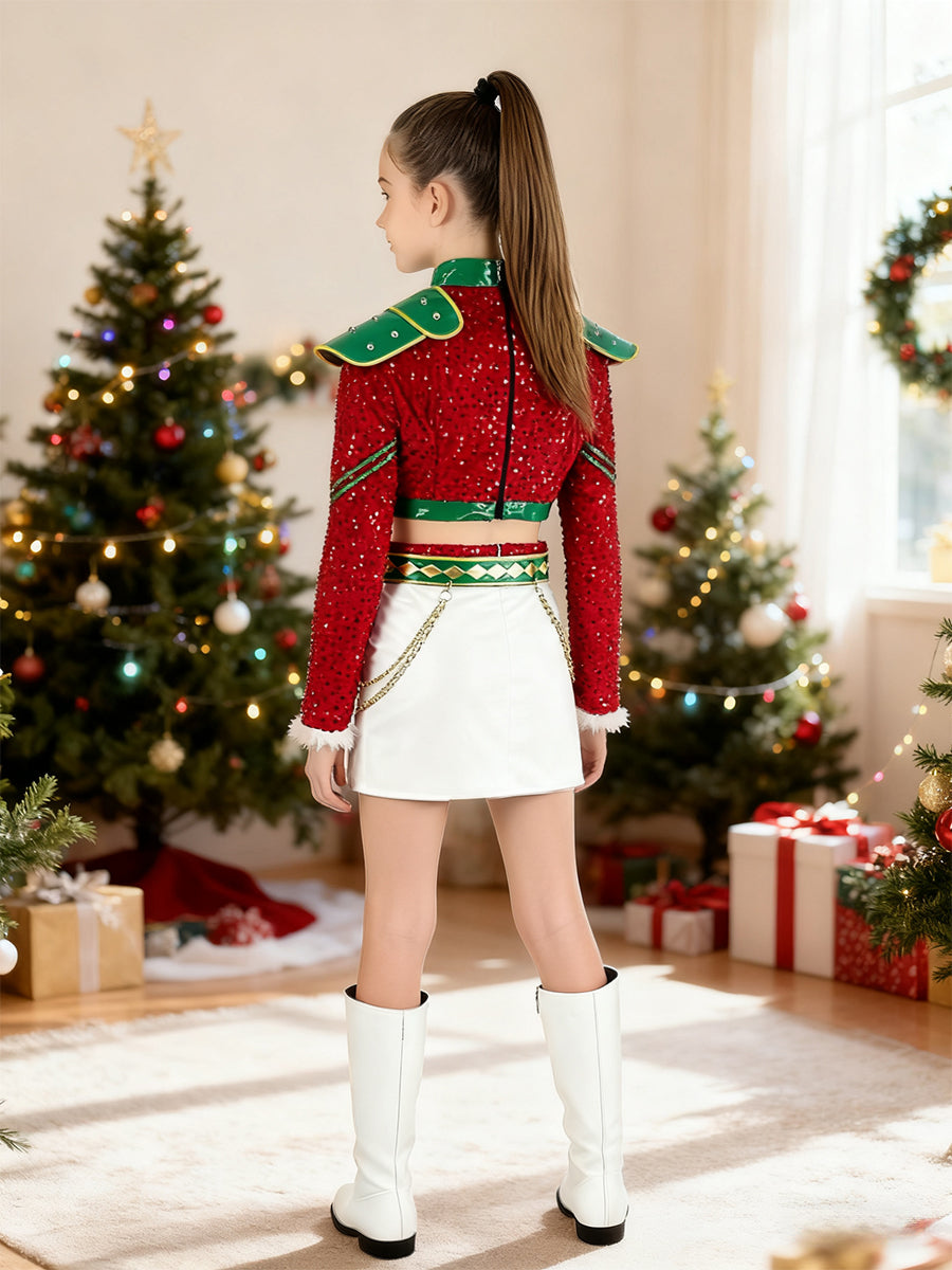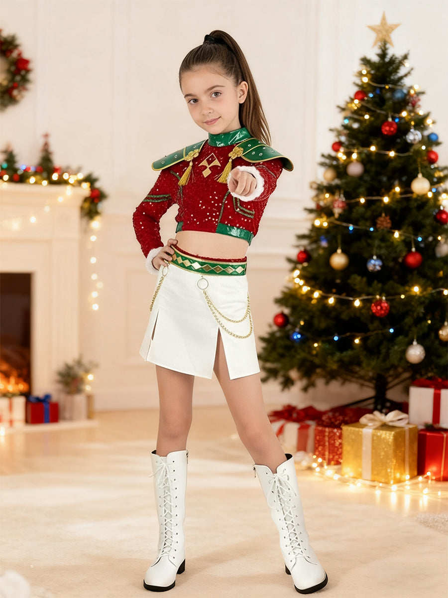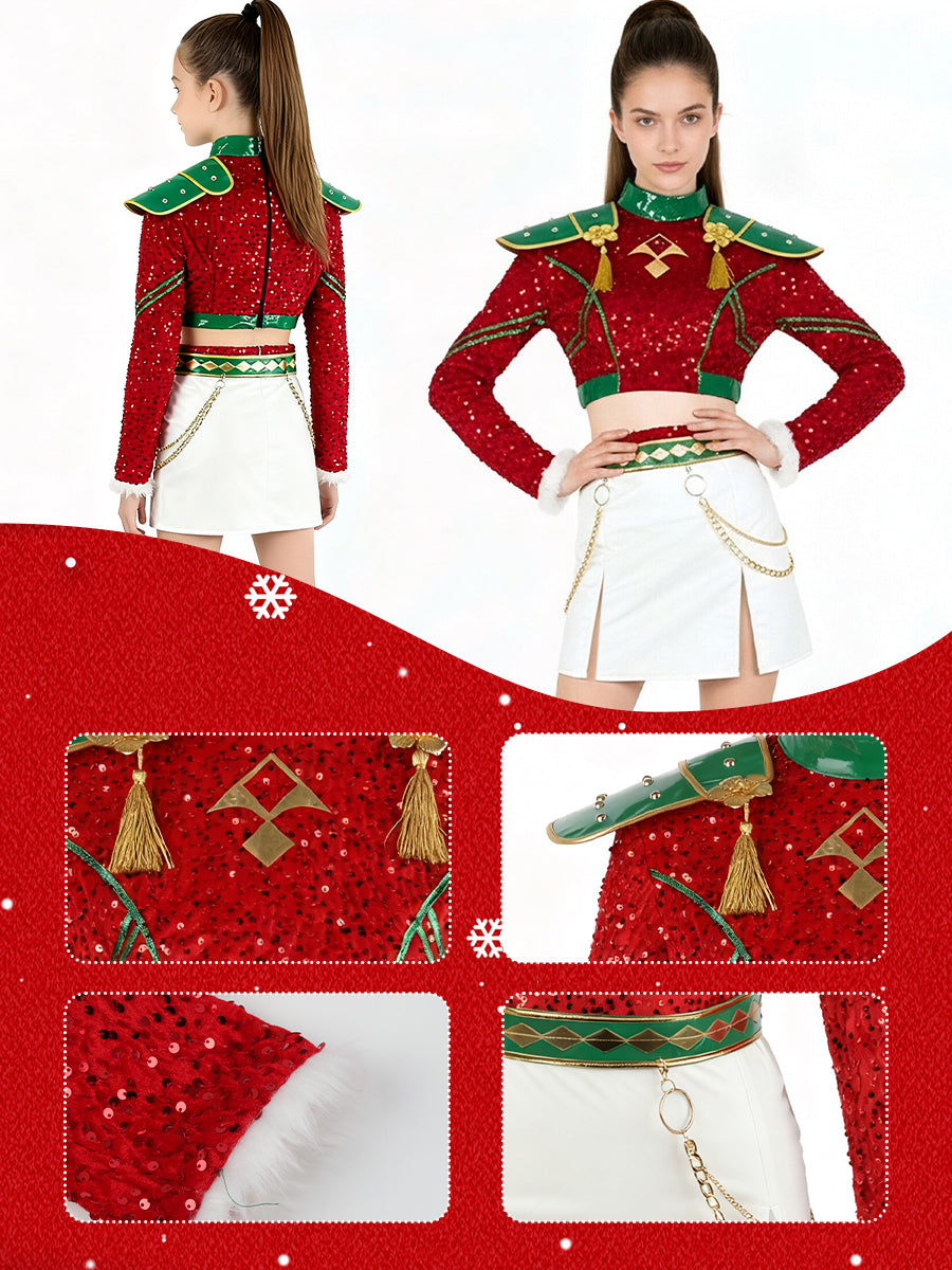 Design: Christmas Super Idol Costume featuring a red sequin crop jacket adorned with green epaulets, metallic trim, and golden tassels, creating a bold, and a matching white mini skirt comes detailed with layered metallic chains, oversized rings, and sequin waistband accents, it’s perfect for creating a fun and festive holiday look.