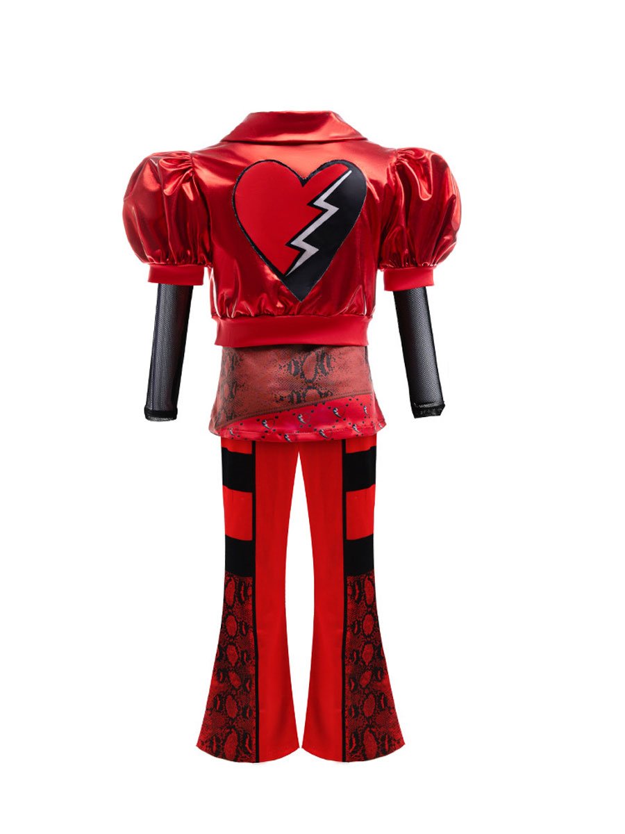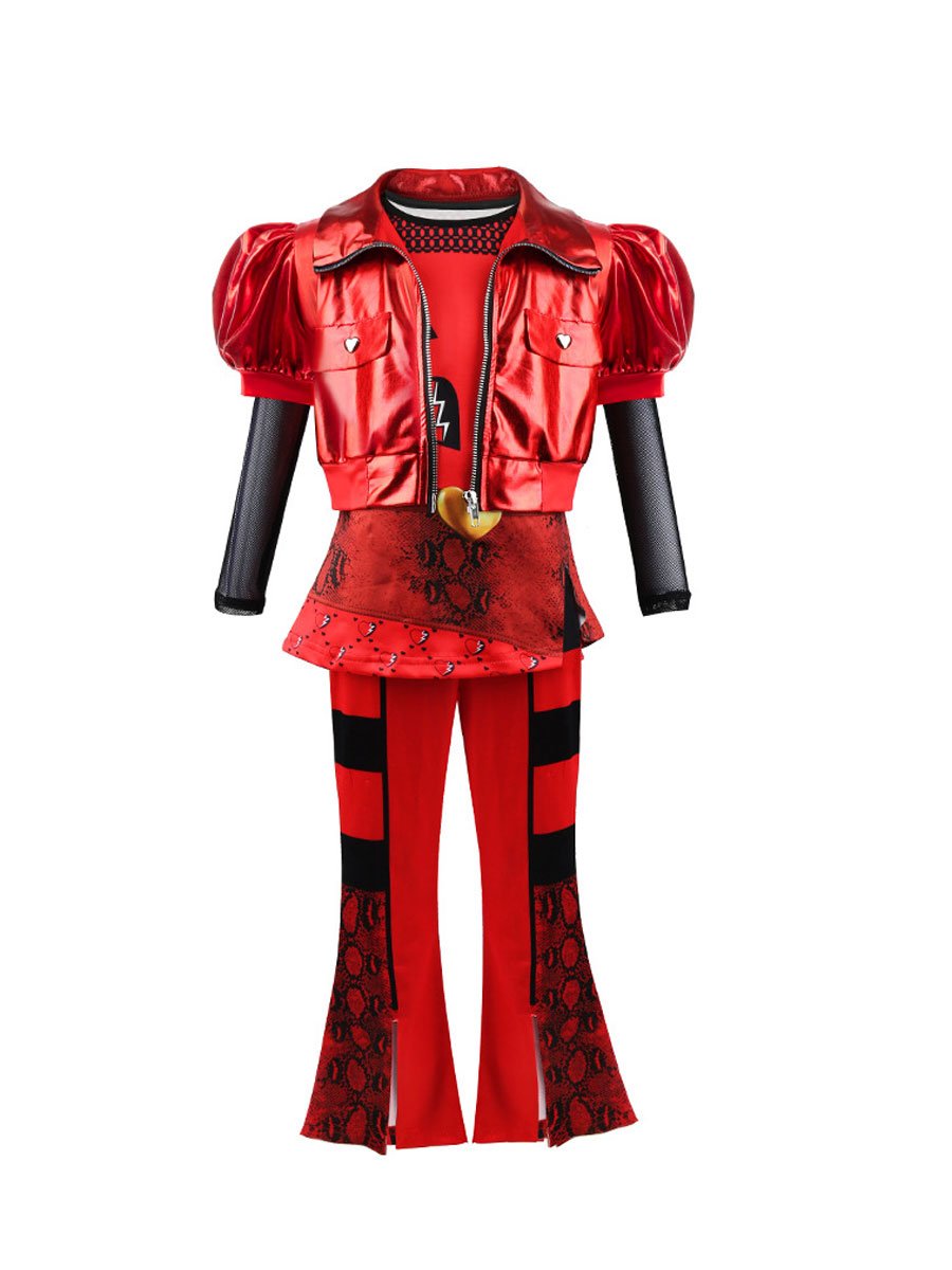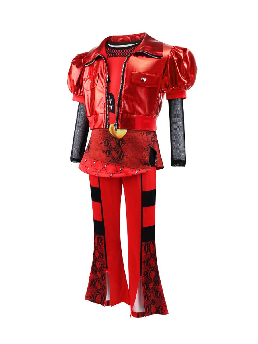 Design: American musical comedy film costume featuring a red pu leather short jacket, half puff sleeves, a matching t-shirt and pants, an allover 3D printed design, restores the princess character.