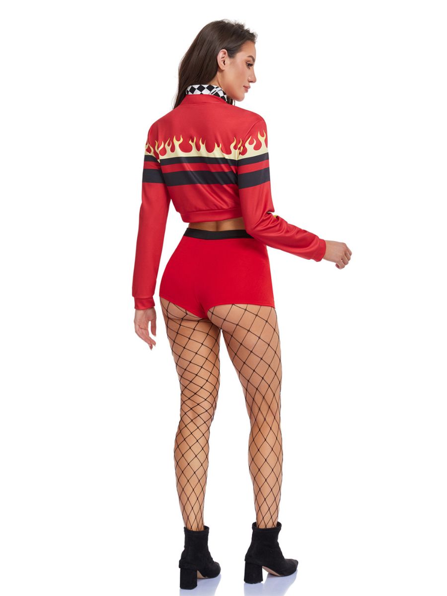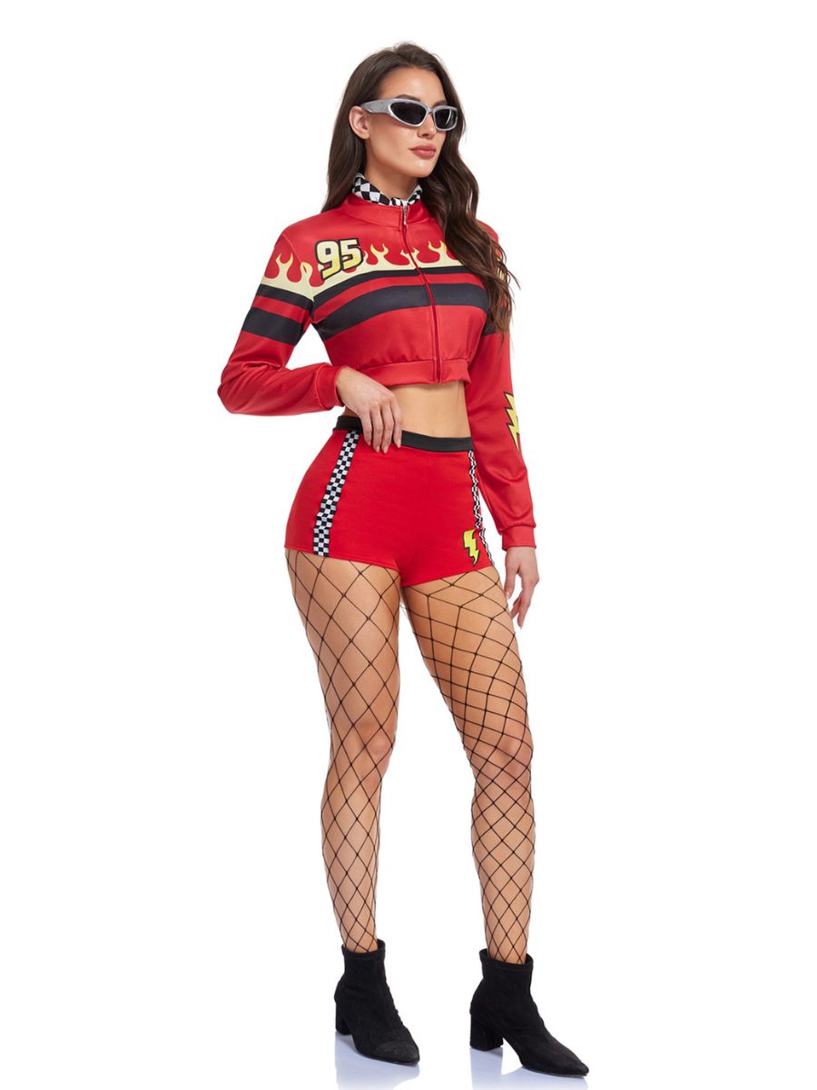 Design: Turn heads in this sexy Racer Girl Costume featuring a zip-front jacket with long sleeve, yellow lightning bolts on the sleeves, flame graphics on the chest, a red bikini-style top, and a matching red shorts, black and white checkered side panels and a lightning bolt patch for an authentic trackside look.