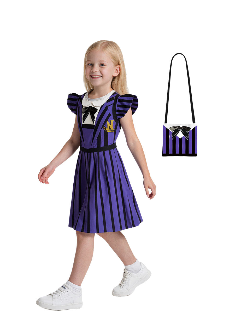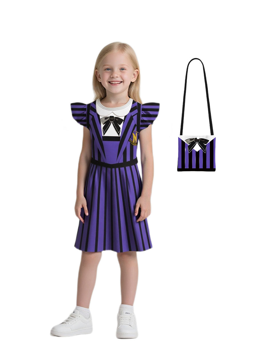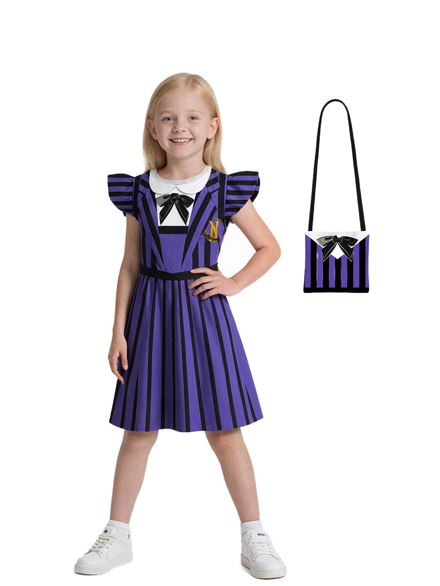 Design: This charming kids’ costume set features a purple and black striped dress with flutter sleeves and a matching shoulder bag for a complete look. The soft, breathable fabric ensures comfort for all-day wear, while the coordinated bag adds extra cuteness and practicality, allowing little ones to carry their small treasures wherever they go.