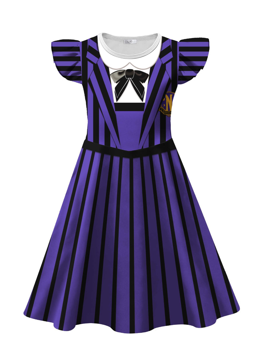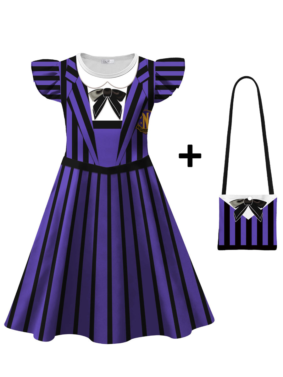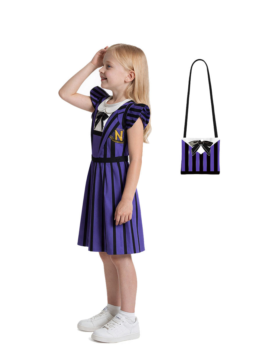 Design: This charming kids’ costume set features a purple and black striped dress with flutter sleeves and a matching shoulder bag for a complete look. The soft, breathable fabric ensures comfort for all-day wear, while the coordinated bag adds extra cuteness and practicality, allowing little ones to carry their small treasures wherever they go.