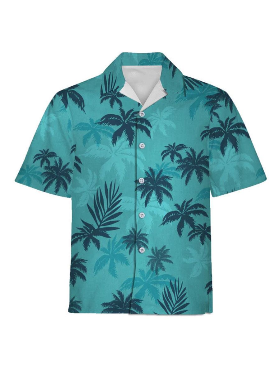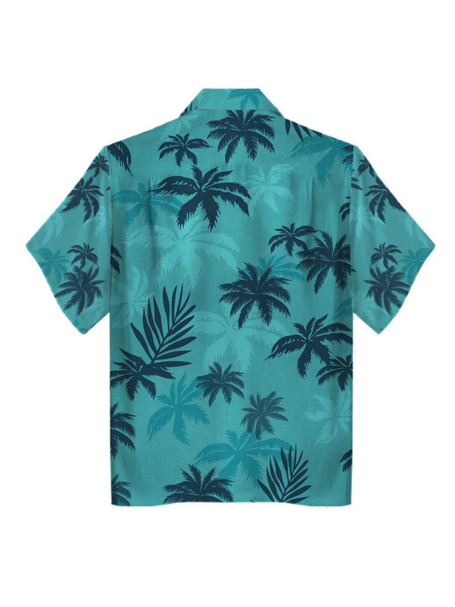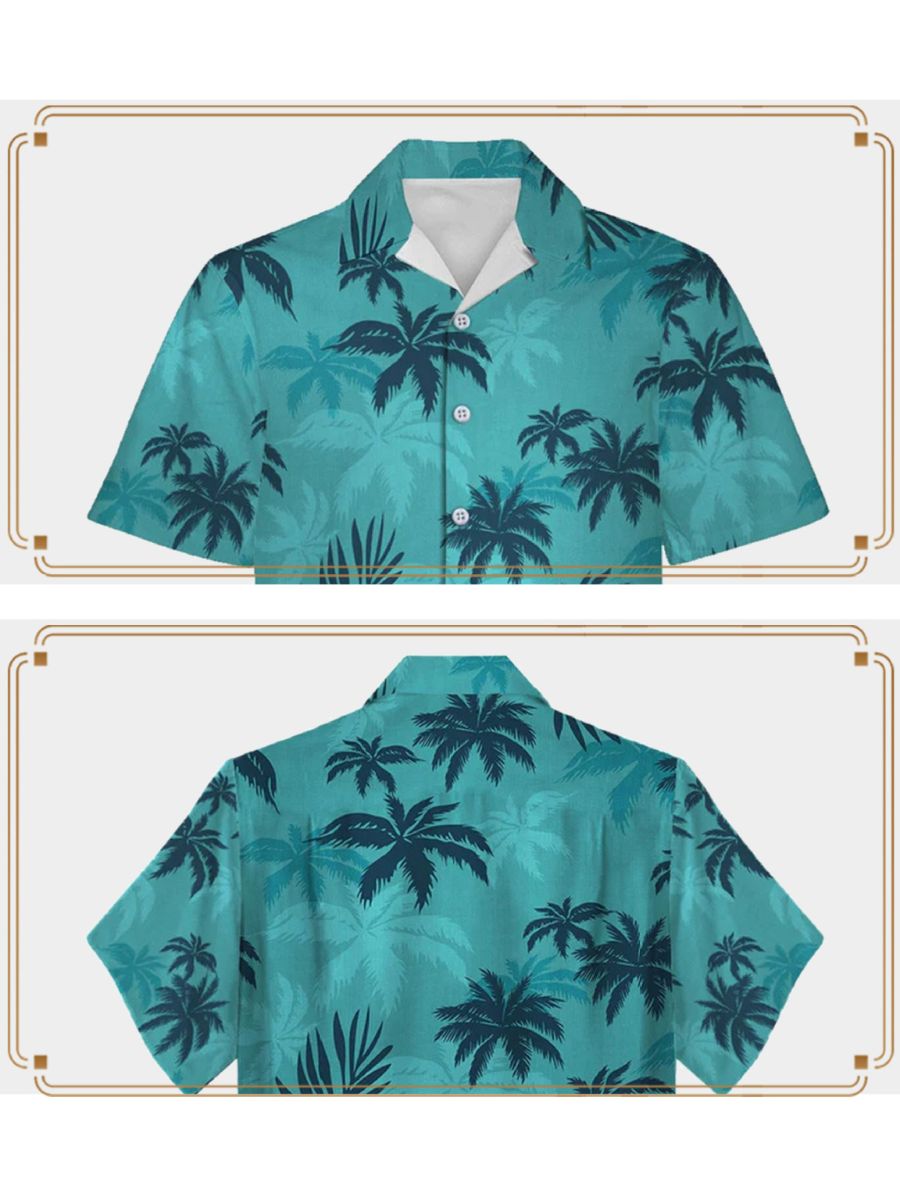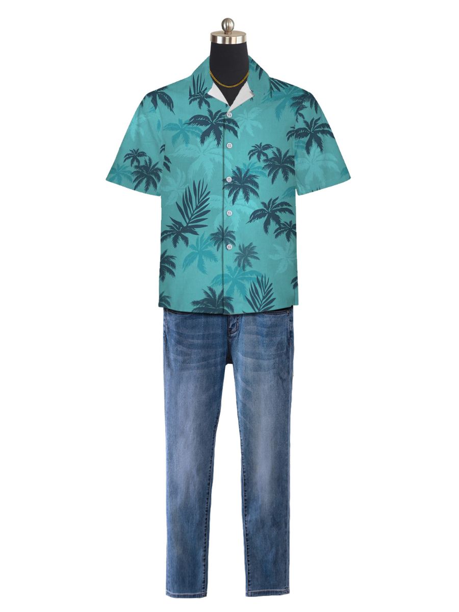 Design: Game Crime Family Costume featuring a short-sleeved button-up shirt with a with palm leaf patterns, and a matching medium-wash jeans, restores the roles character.