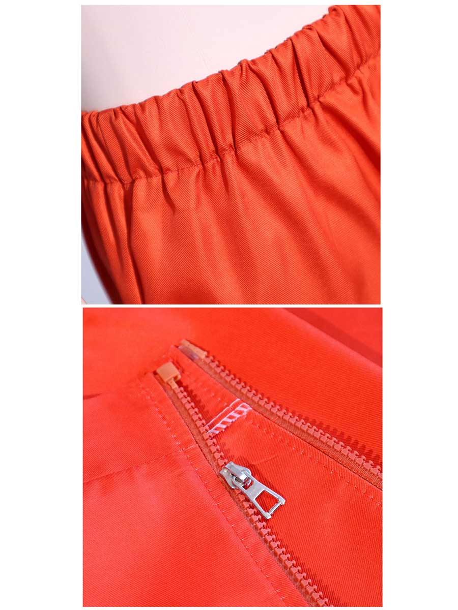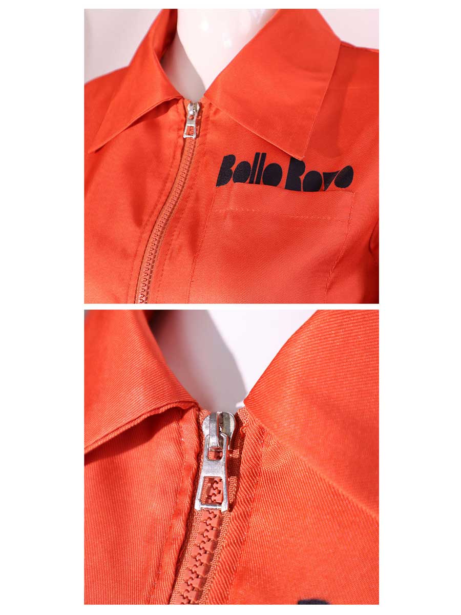 Design: Bad Girl Convict Costume inspired by anime television character, featuring a zip up, orange, long sleeve jacket, a letter printed on the chest, and a matching full-length pants with elastic waistband. Stand out from the crowd and embody your favorite character with this stunning cosplay costume.
