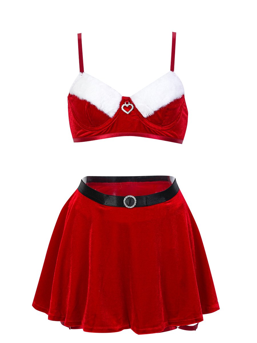 Design: This Red Christmas Costume featuring a red velvet bra with underwire cups, a white faux fur trim, adjustable spaghetti straps, a hook and eye back closure, and a matching mini skirt with elastic band and adjustable garters.