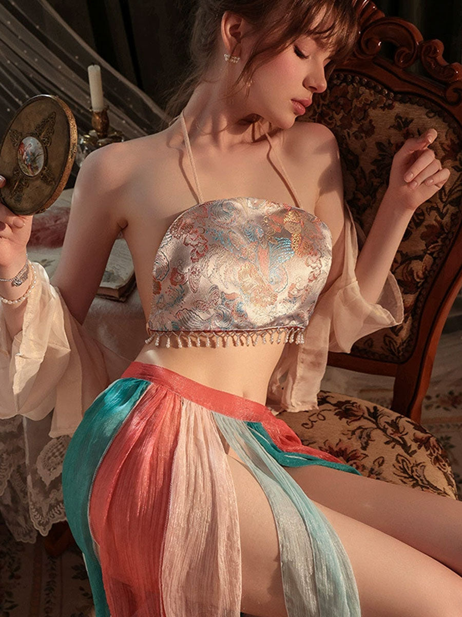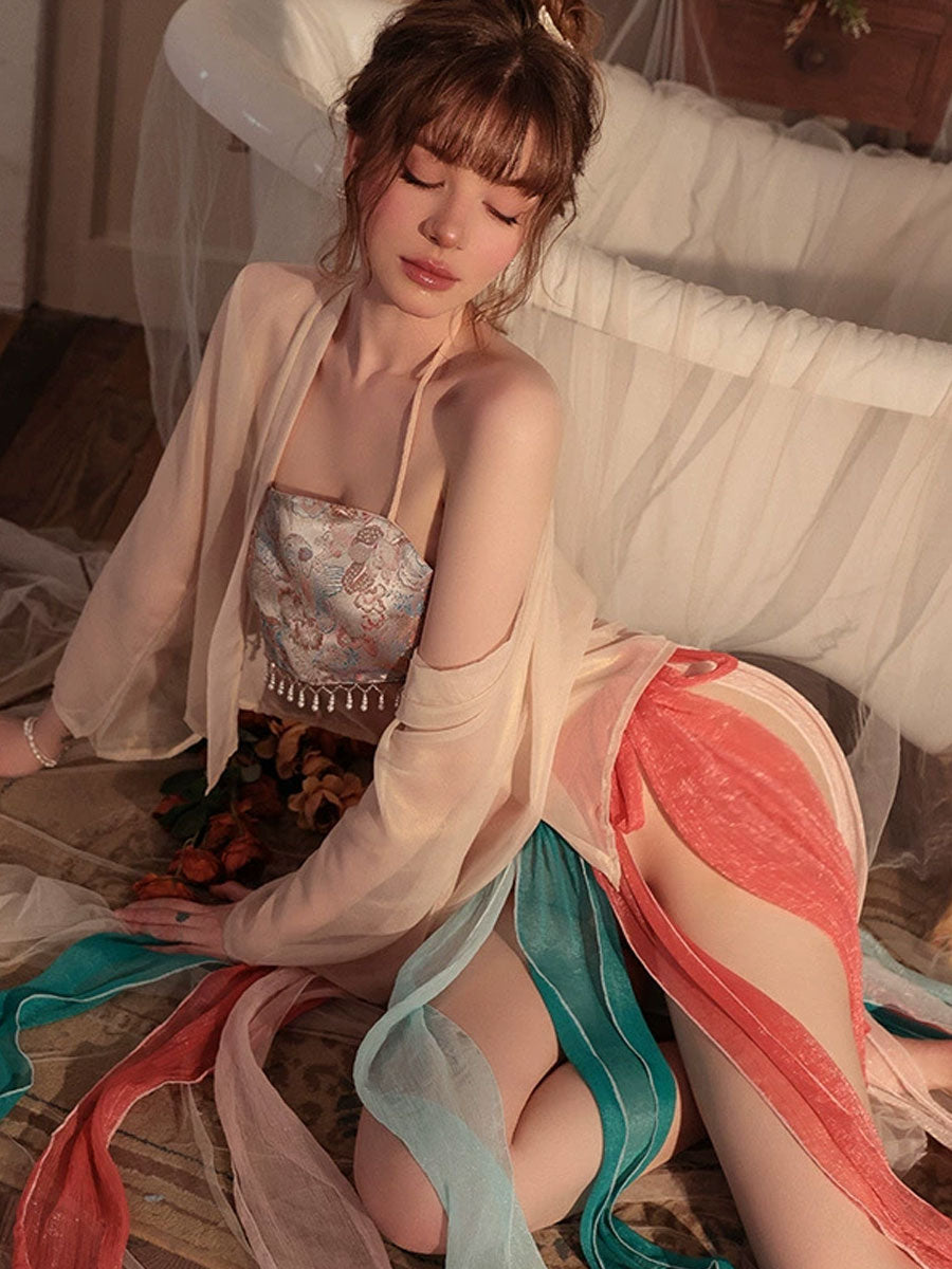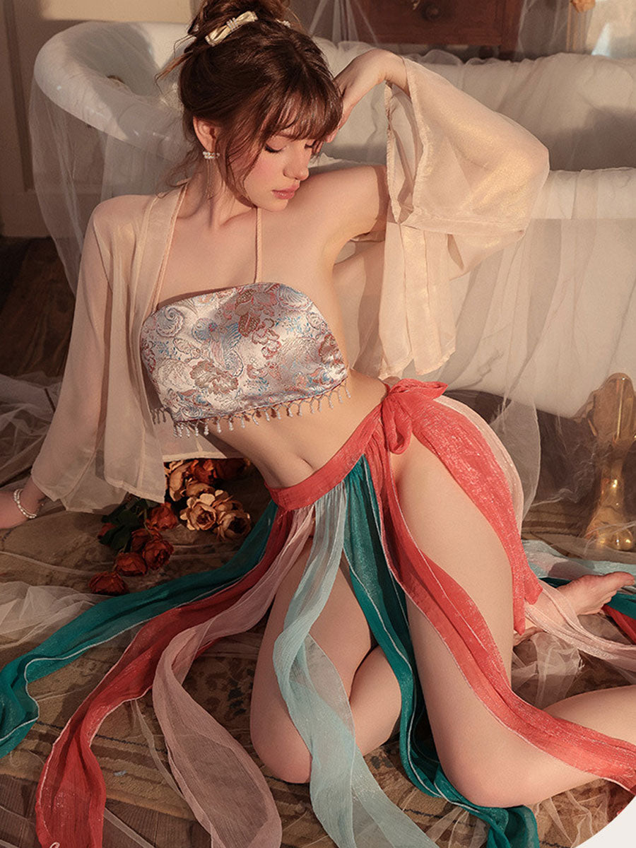 Design: This 4-Piece Sexy Geisha Costume features a sheer kimono jacket that drapes elegantly for an ethereal touch, a brocade tube top embroidered with delicate floral patterns, a multi-layered chiffon skirt, and a matching panty.