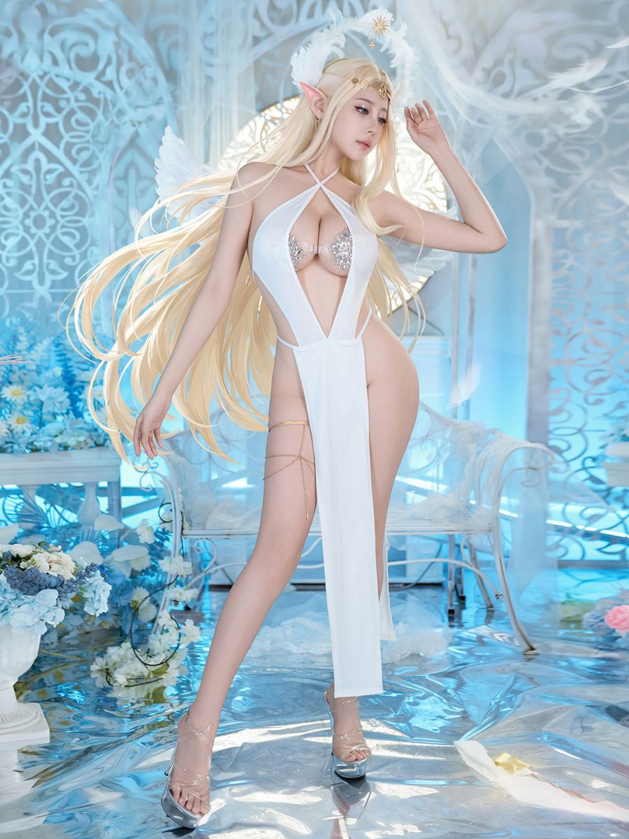Design: Yomorio Sexy Queen Costume featuring a white, sheer long dress, a plunging halter neckline, overlaid with long, draped panels of white sheer chiffon or similar flowing fabric, and attached arm drapes with wrist cuffs.