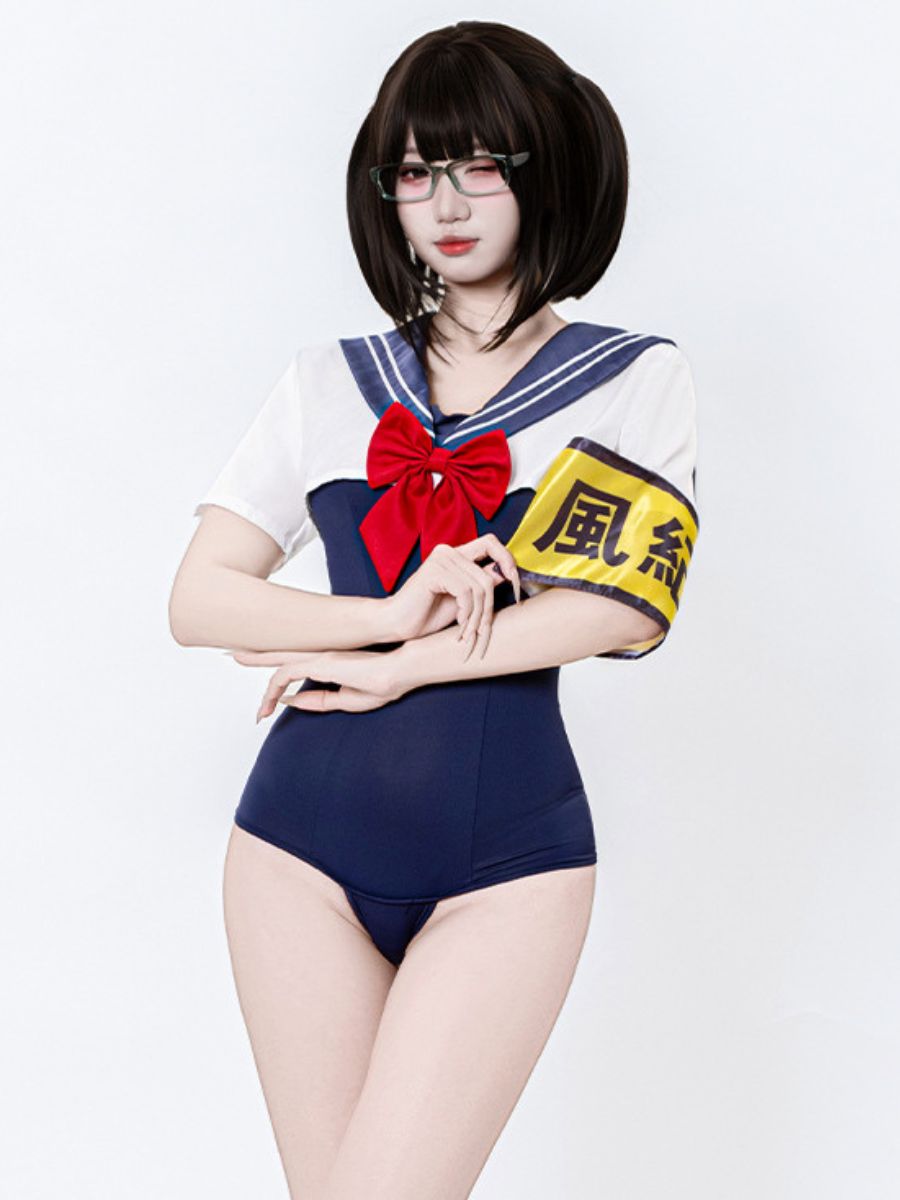 Design: Japanese School Girl Costume featuring a white cropped top with short sleeve, a traditional sailor collar, a striking red bow at the front, and a matching navy blue bodysuit, for a great cosplay costume look.