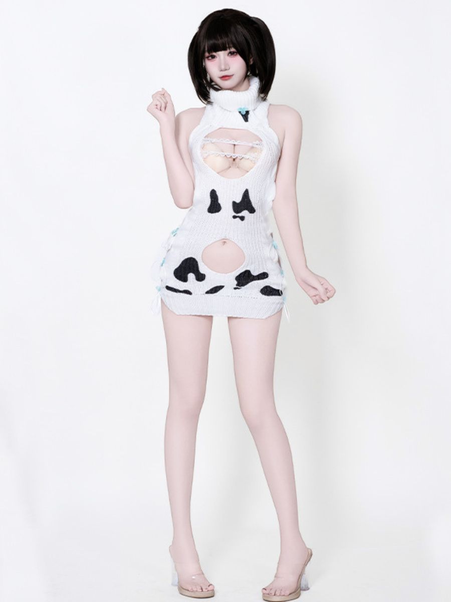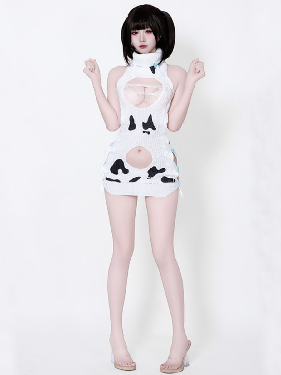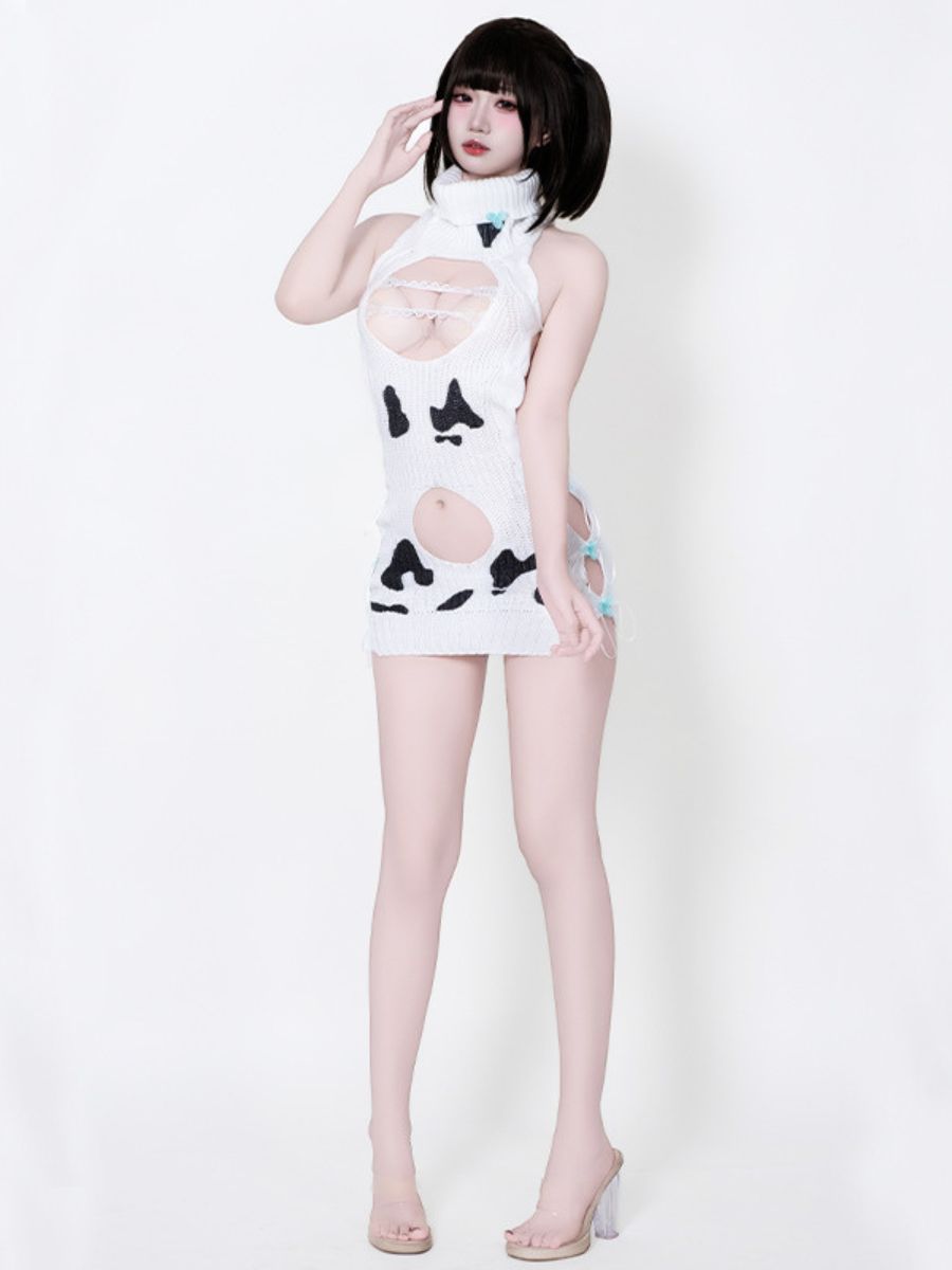 Design: Yomorio Sexy Milk Cow Cosplay Costume features a ribbed knit mini dress with cow print design, a high turtleneck, front a large keyhole, and slit hemline.