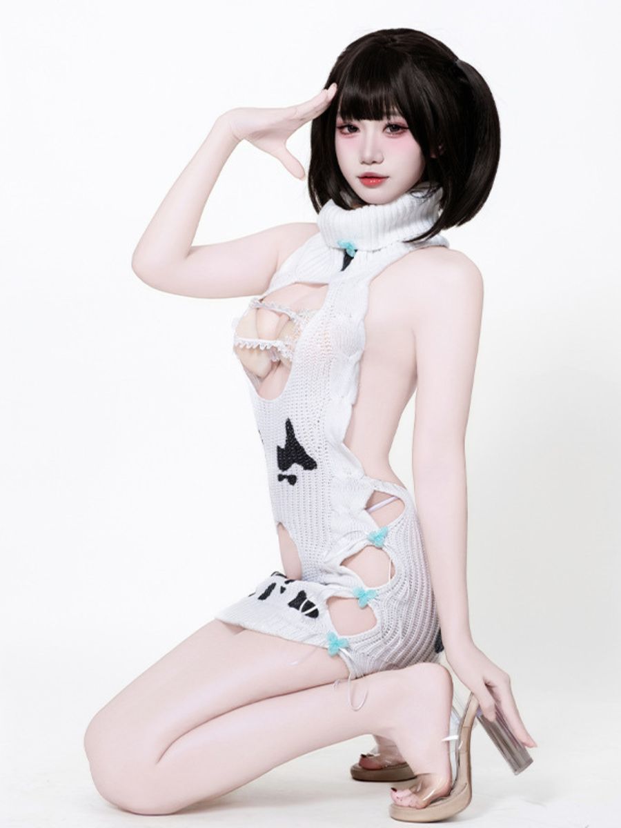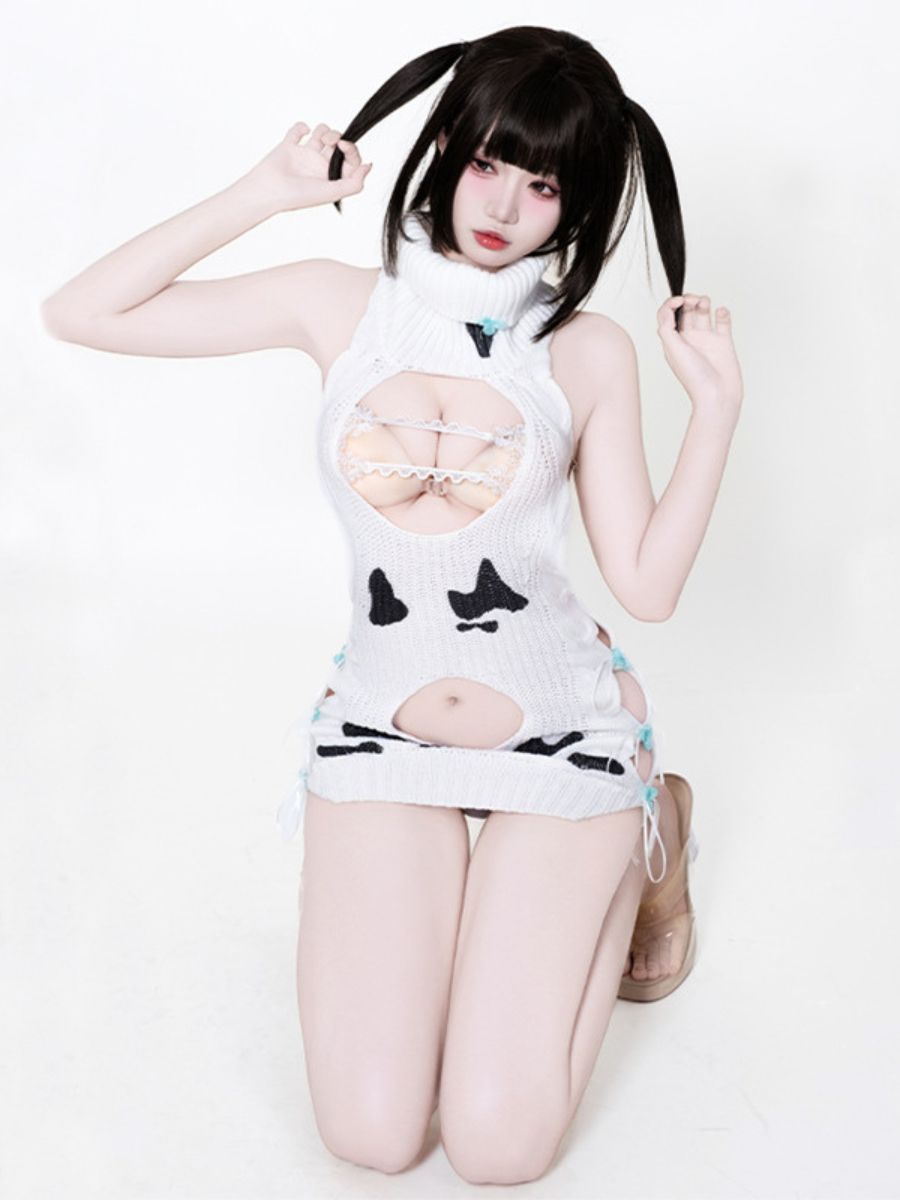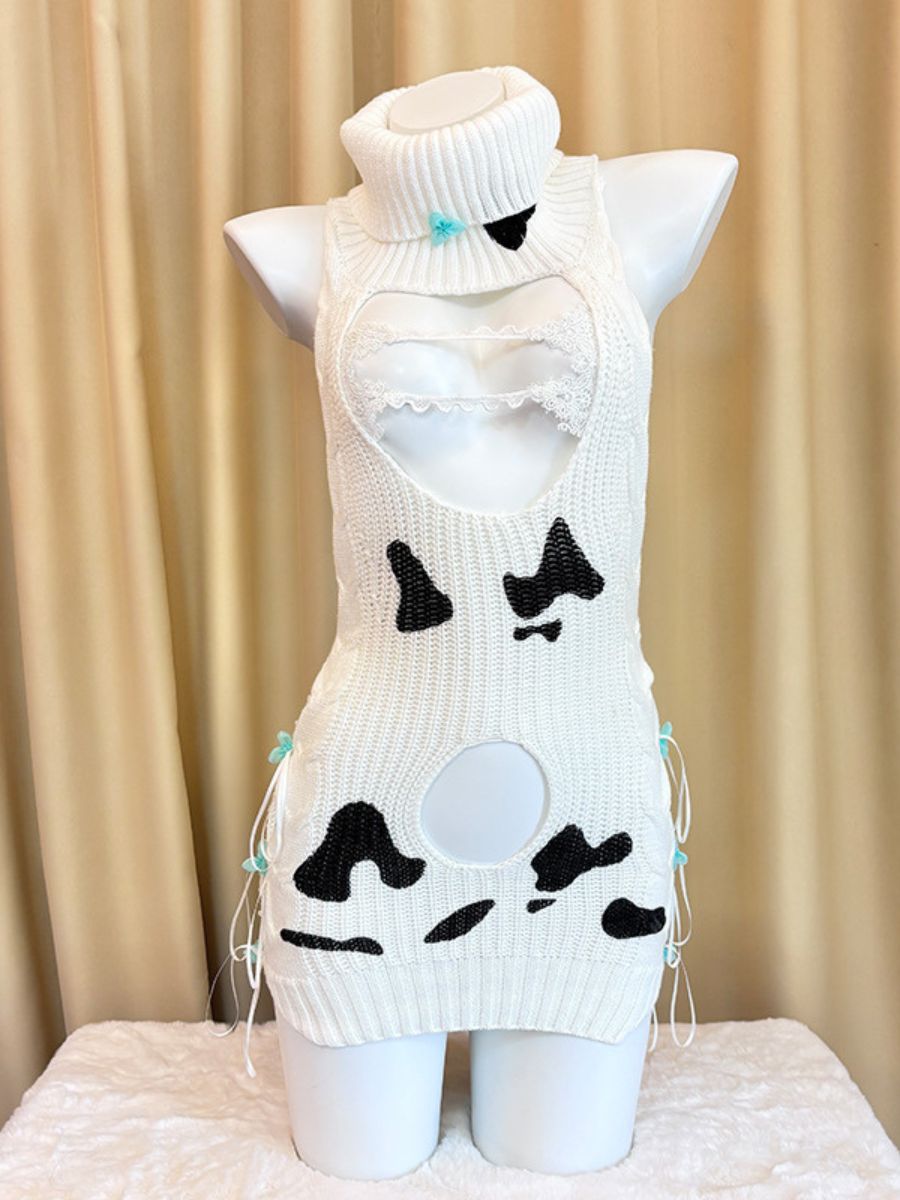 Design: Yomorio Sexy Milk Cow Cosplay Costume features a ribbed knit mini dress with cow print design, a high turtleneck, front a large keyhole, and slit hemline.