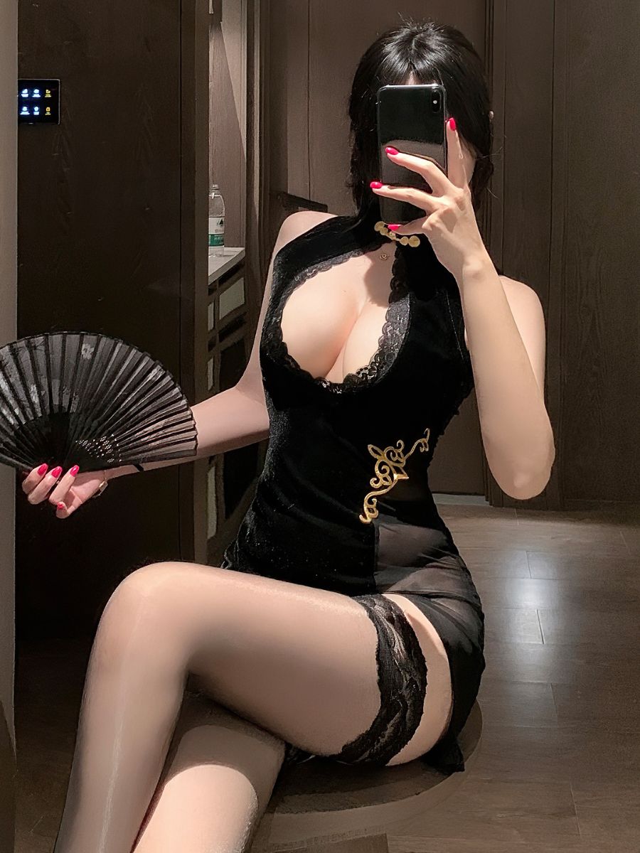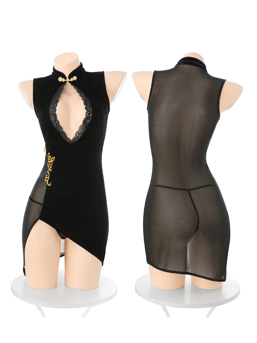 Design: Sexy Chinese Cheongsam Lingerie features black velvet mini dress with classic mandarin collar, a vintage-inspired gold frog button, a bold, plunging keyhole cutout, a asymmetric, high-slit hemline adds a final touch of flirtatious flair.