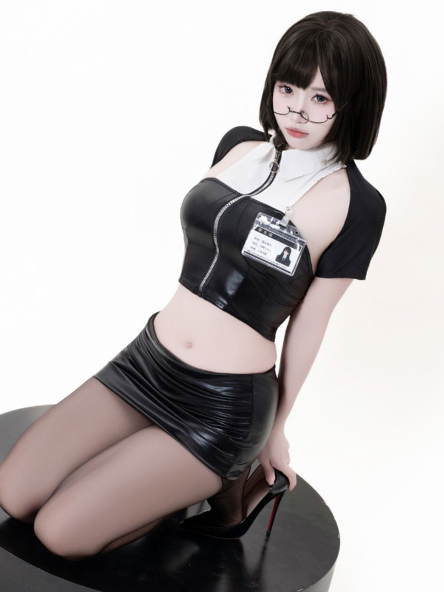 Design: This office lady role-playing outfits features vinyl crop top with a high, contrasting white collar, a silver front zipper closure, and high-waisted micro mini skirt, to show off your ultra-sexy and chic figure.