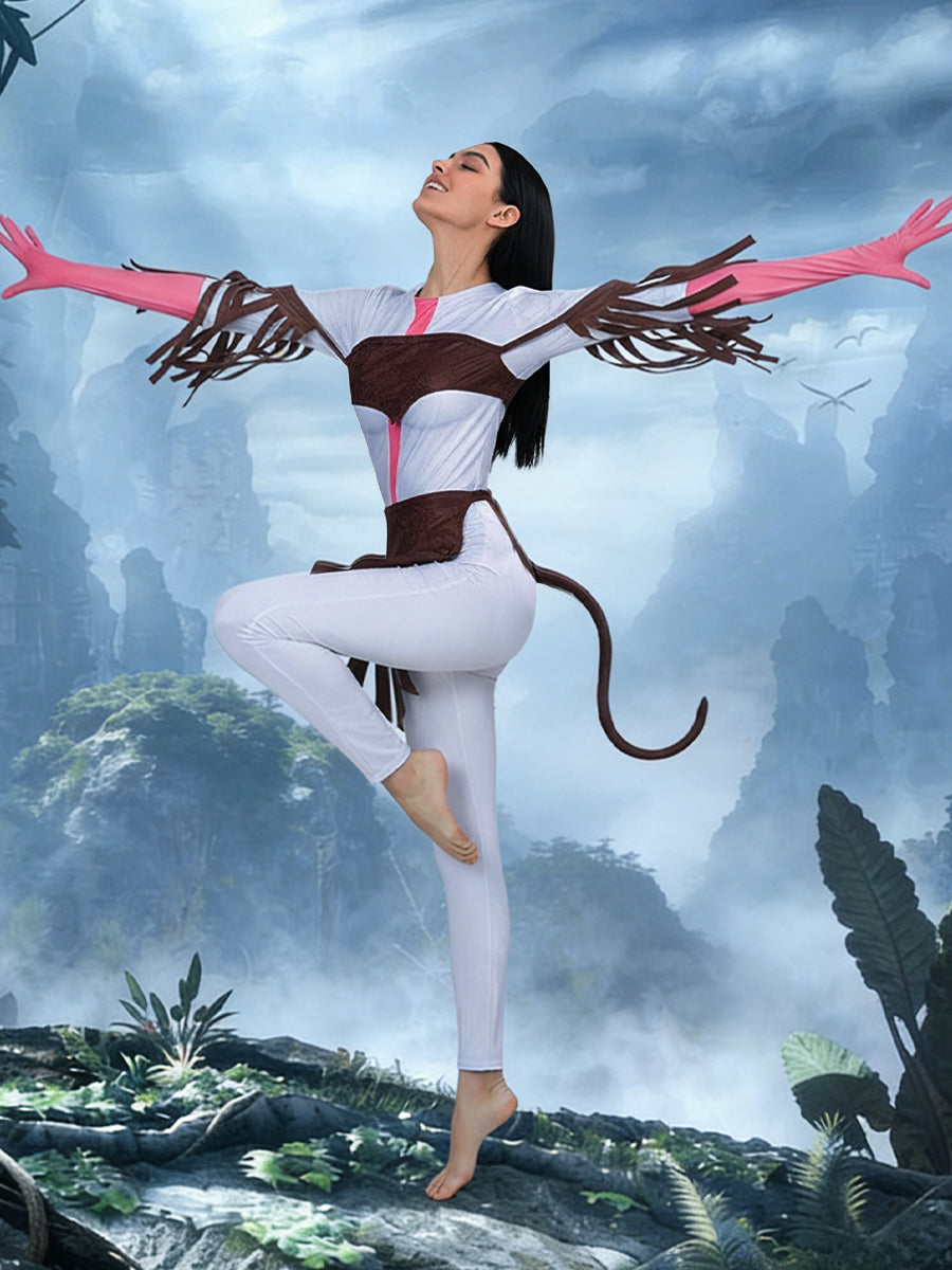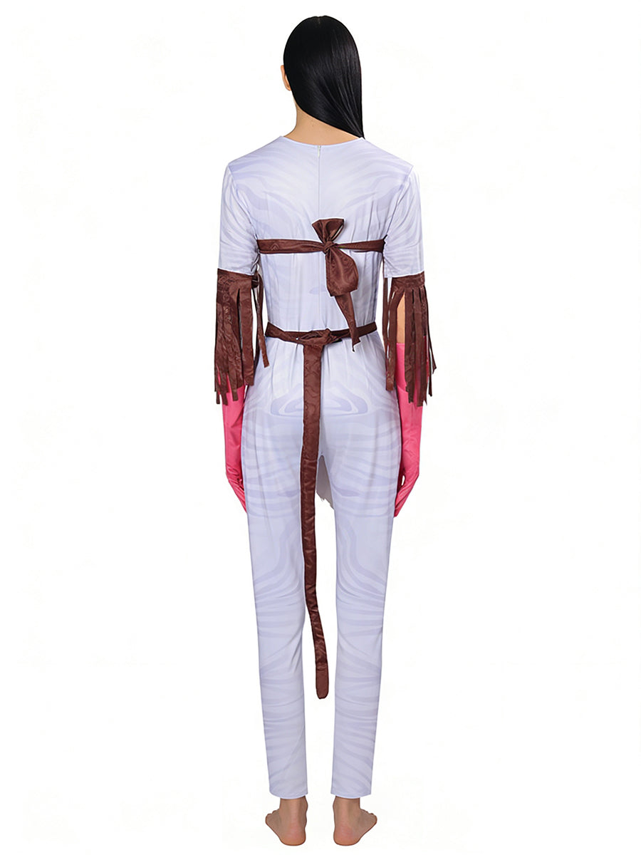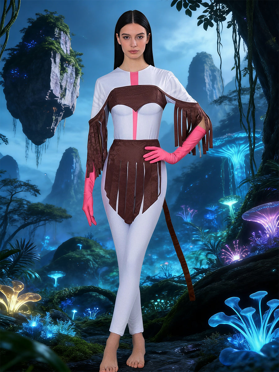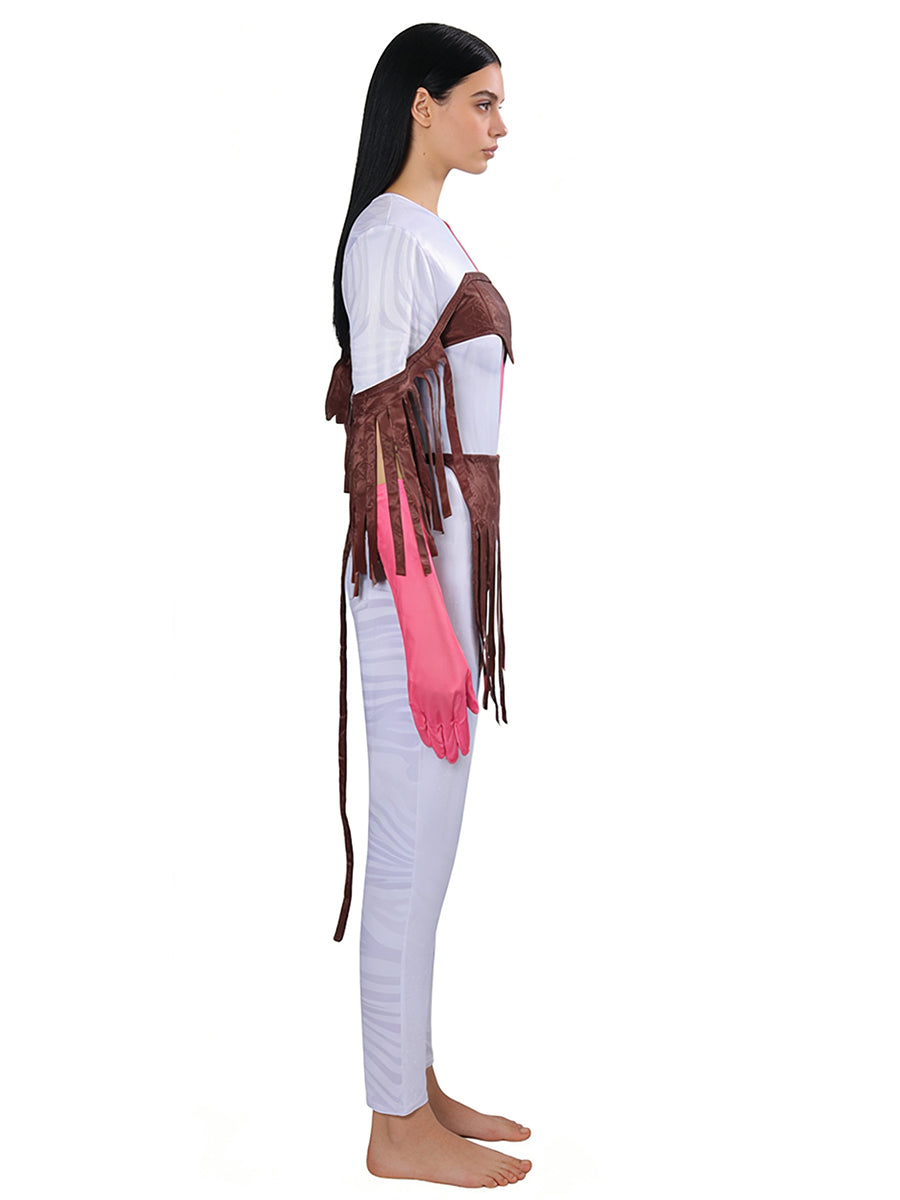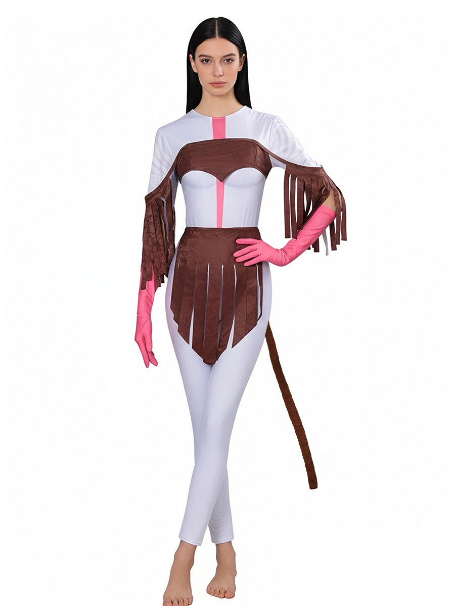Design: This Fringed Tribal-Style Costume features a sleek, form-fitting white jumpsuit, back zipper up closure, overlaid on top is a textured brown fringe set, and a matching fringed skirt panel for dynamic movement.
