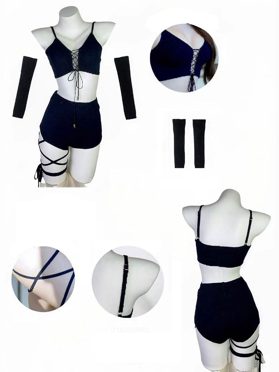Design: Yomorio Sexy Rib Knit Lingerie Set show your perfect body curve. The crop top features adjustable shoulder straps, front lace-up closure offer flexible sizing and a snug fit, a high-waisted shorts with leg harness, and matching arm sleeves, this set blends sultry with street-style attitude.