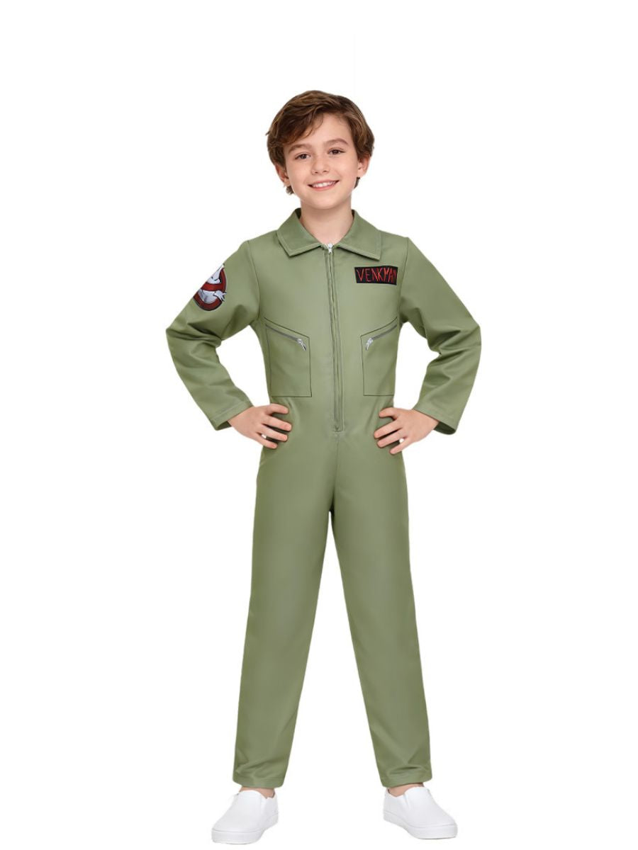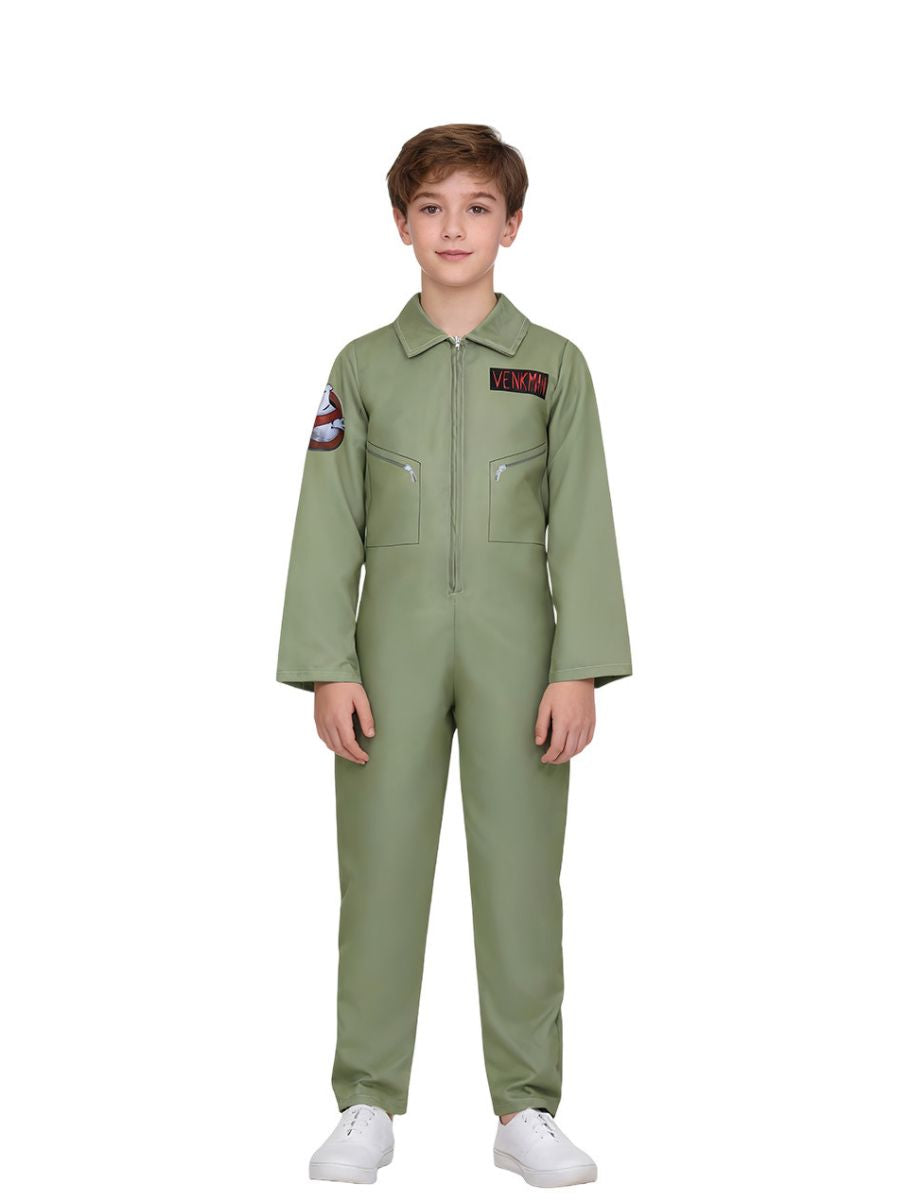 Design: Kids Ghost Jumpsuit featuring a full-body olive green jumpsuit with long sleeve, front zipper up closure, 3D print, restores the roles character.