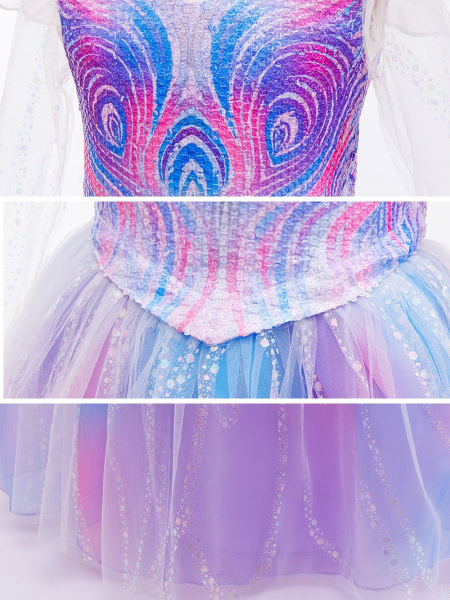 Design: This fairy princess dress costume featuring a magical blend of vibrant color and shimmering sparkle, the shoulders are adorned with delicate, ruffled organza flutter sleeves, and the entire skirt is dusted with fine glitter or sequins that catch the light, enhancing the magical effect.