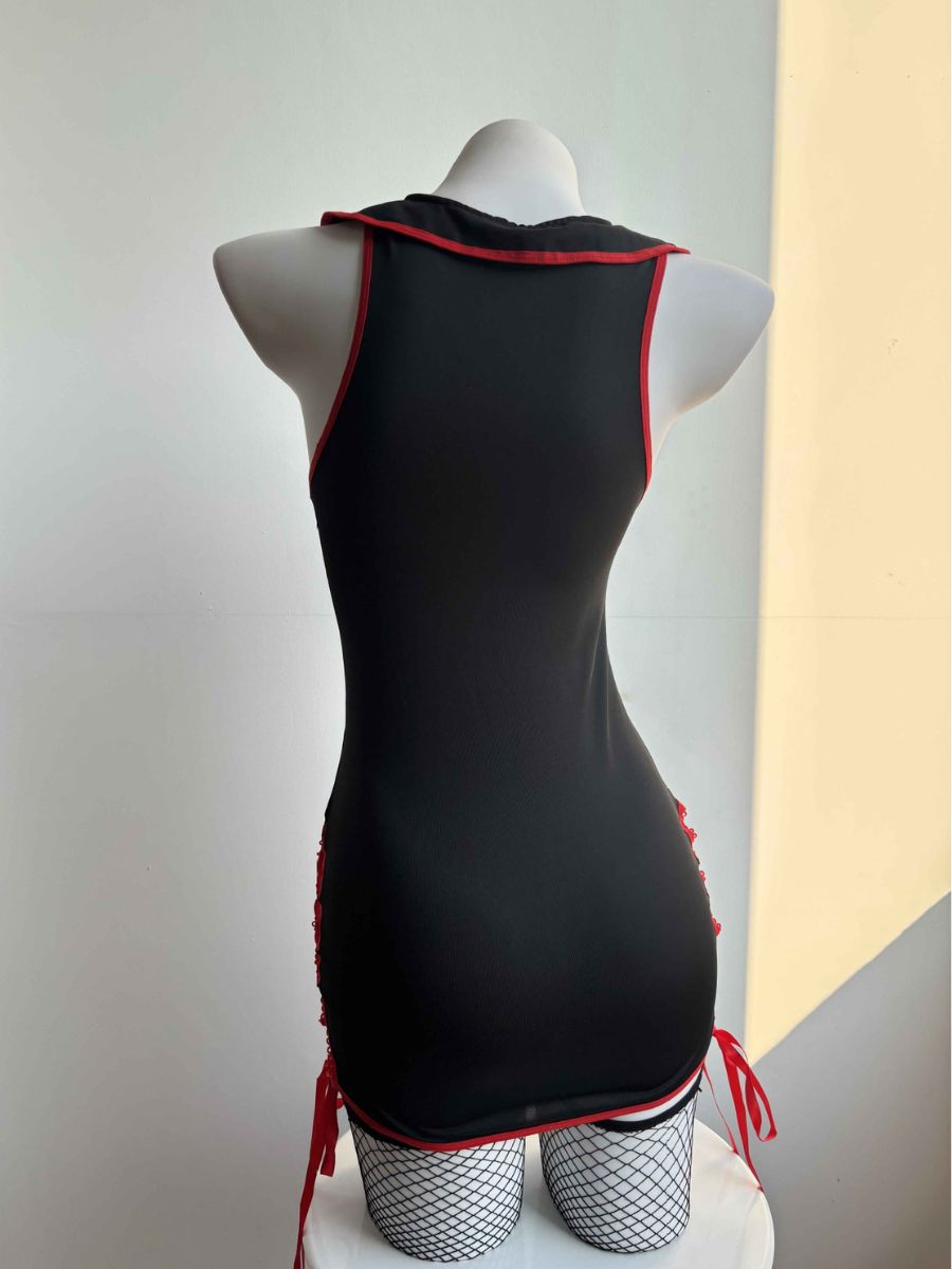 Design: Nurse Cosplay Lingerie featuring black mini dress, a deep V-cut with red piping, iconic red cross patches on the bust, sides lace-up hemline.