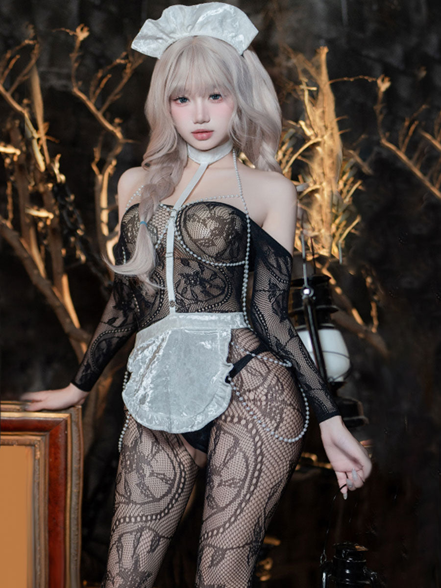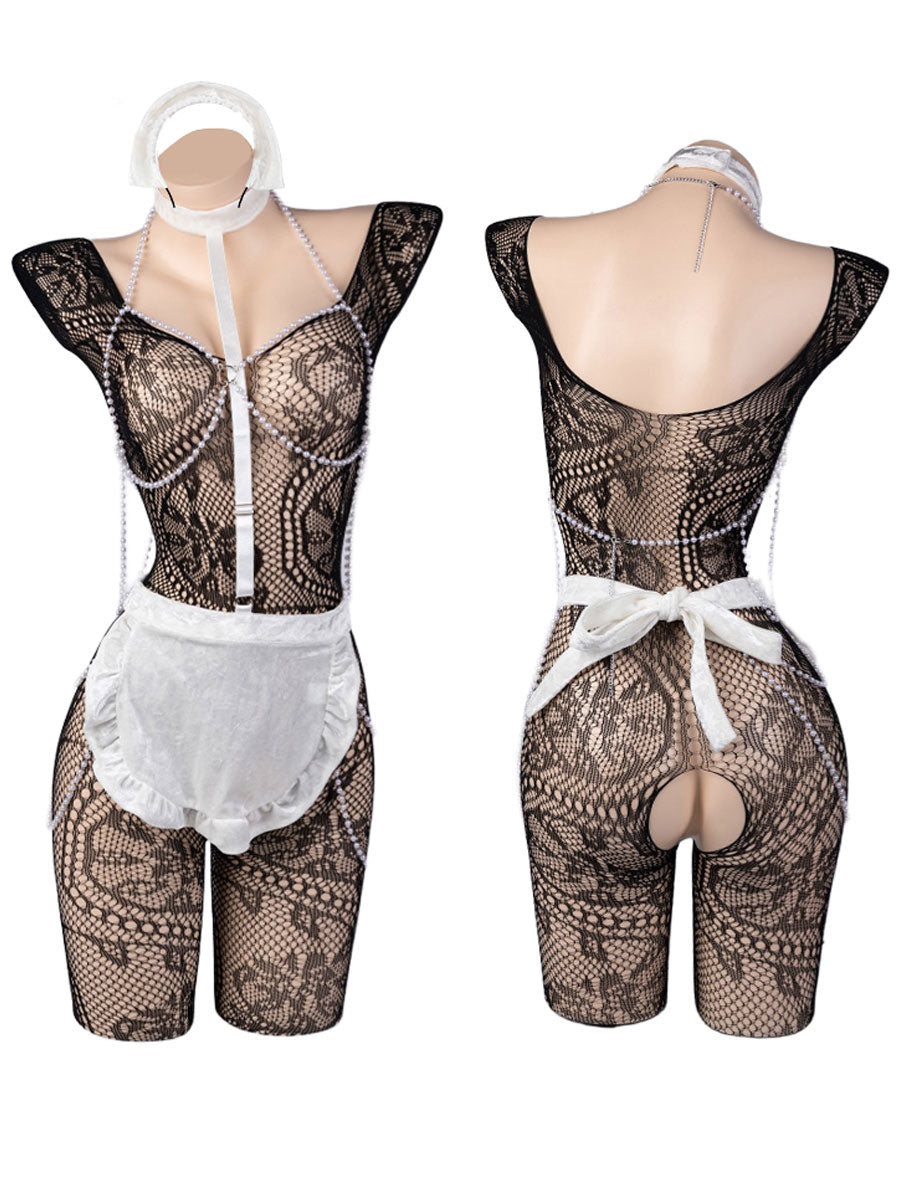 Design: This sexy maid costume features a delicate lace bodystocking that hugs your curves, paired with a dainty halter apron for a touch of vintage charm. The sultry open crotch design adds an unexpected edge, while the bra chain detail enhances the glamour of the look. Complete with a soft headpiece, this ensemble is the perfect mix of elegance and temptation—ideal for roleplay, special nights, or simply embracing your inner seductress.