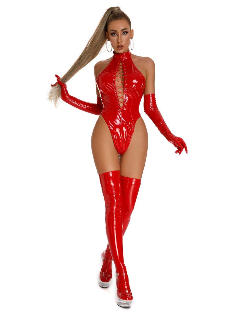 Design: This wet look club outfit features faux leather bodysuit, crotch zipper up closure, front crisscross lace up design, a matching patent leather gloves and thigh high stocking to complete the silhouette.
