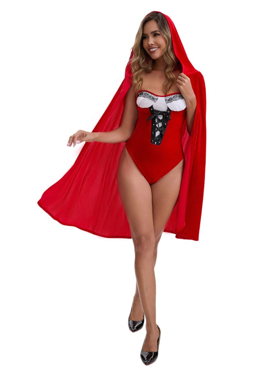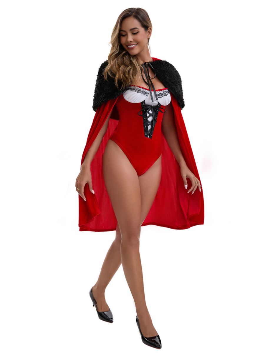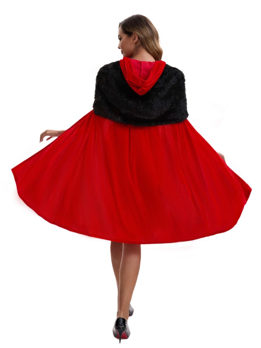 Design: The Sexy Mrs Claus Costume featured a red velvet bodysuit, a flattering corset-style lace-up front, while the white ruffled bust trimmed with black lace adds a touch of innocence. Completing the look is a dramatic red cape and black faux fur shawl, it’s perfect for creating a fun and festive holiday look.