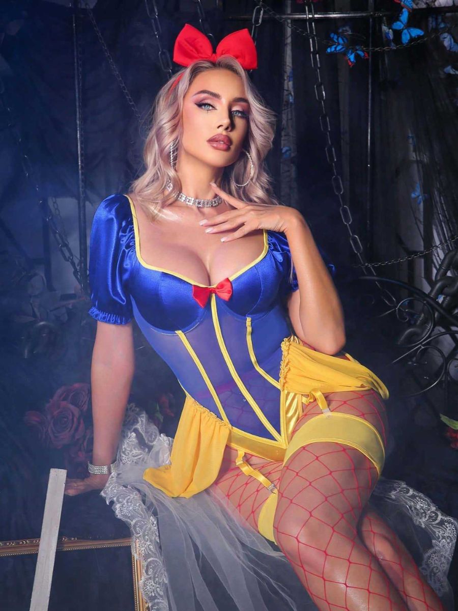 Design: This Snow White lingerie set features a striking blue satin bodysuit with yellow accents, sheer mesh panels, and playful bow details, this outfit is designed to highlight your curves and spark imagination.