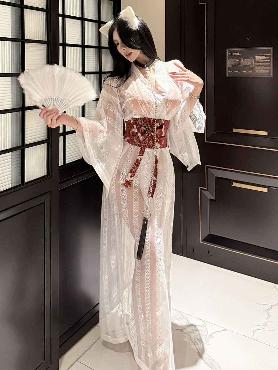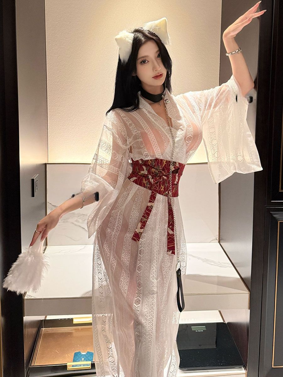 Design: This sexy kimono-inspired lingerie featuring a deep-V neckline robe with flowing bell sleeves and a red satin waist belt that cinches the figure for a flattering hourglass shape.