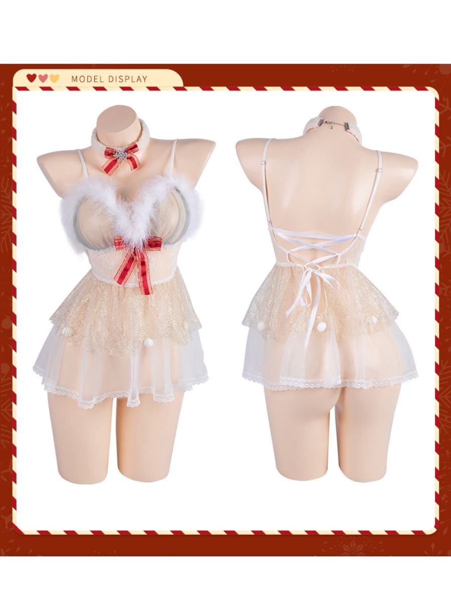 Design: This Sexy Christmas Costume featuring a dreamy champagne gold hue, the outfit features a sheer mesh skirt layered with subtle sparkle and adorned with white faux fur trim for a luxurious winter look. The lace-up back ensures a perfect, adjustable fit, while the red satin bow and matching choker bring a playful Christmas charm.