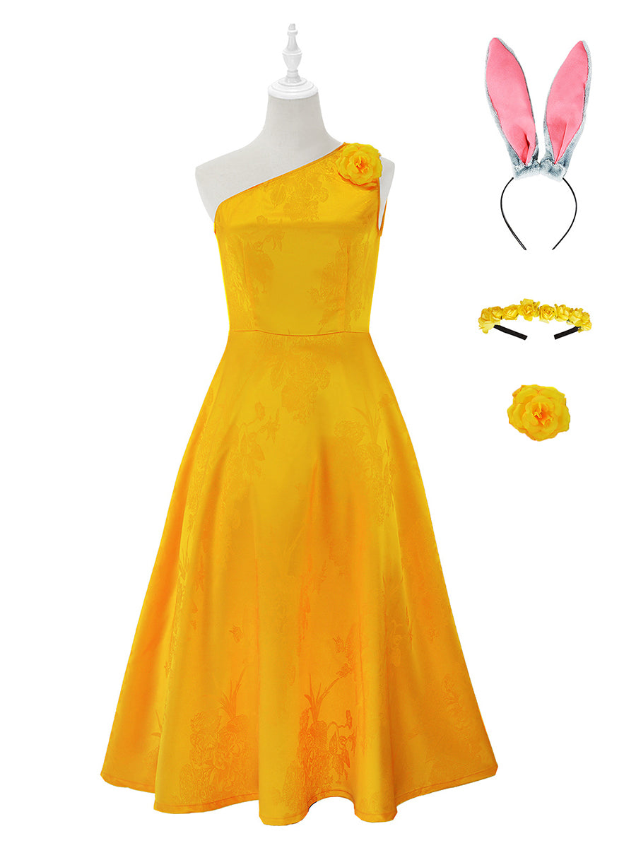 Design: This yellow bunny-inspired one-shoulder costume set featuring a yellow dress, a matching bunny ear headband, a floral hairband, and a yellow corsage— everything you need for a cheerful, eye-catching look.