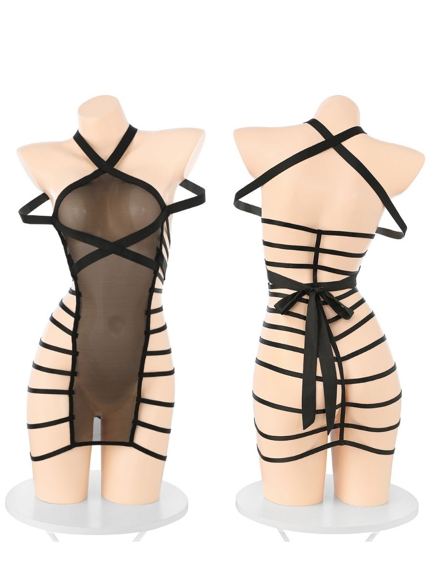 Design: Design: Sexy faux leather harness lingerie looks and feels like the real deal. It's the perfect accessory for a sleek and sexy look, featuring sheer mesh mini dress, back multiple horizontal straps, and an adjustable back belt closure for a perfect fit every time.