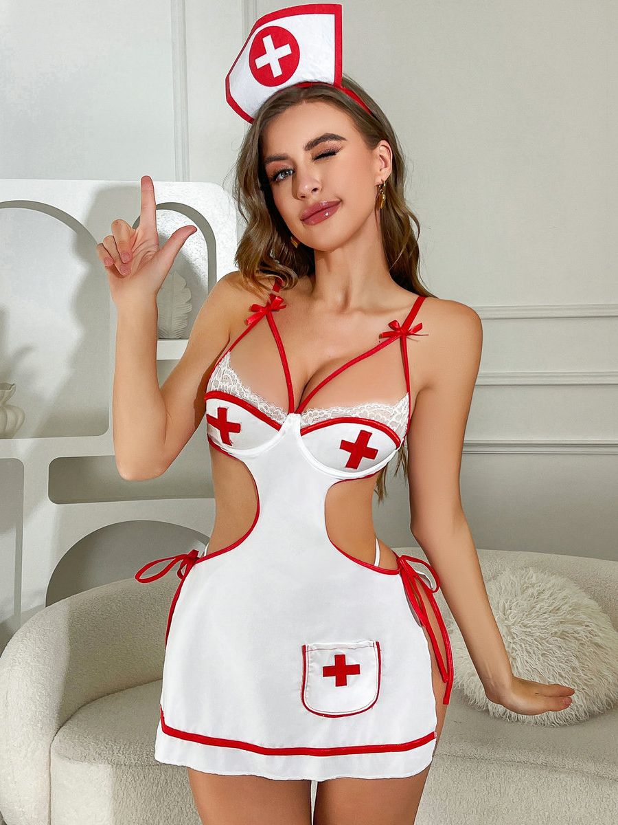 Design: Sexy Nurse Outfit featuring a form-fitting mini dress with bold cut-out sides, red trim accents, and a lace-detailed bust with cross patches. A matching nurse headpiece completes the look, making it the perfect outfit for themed events or fun roleplay moments.