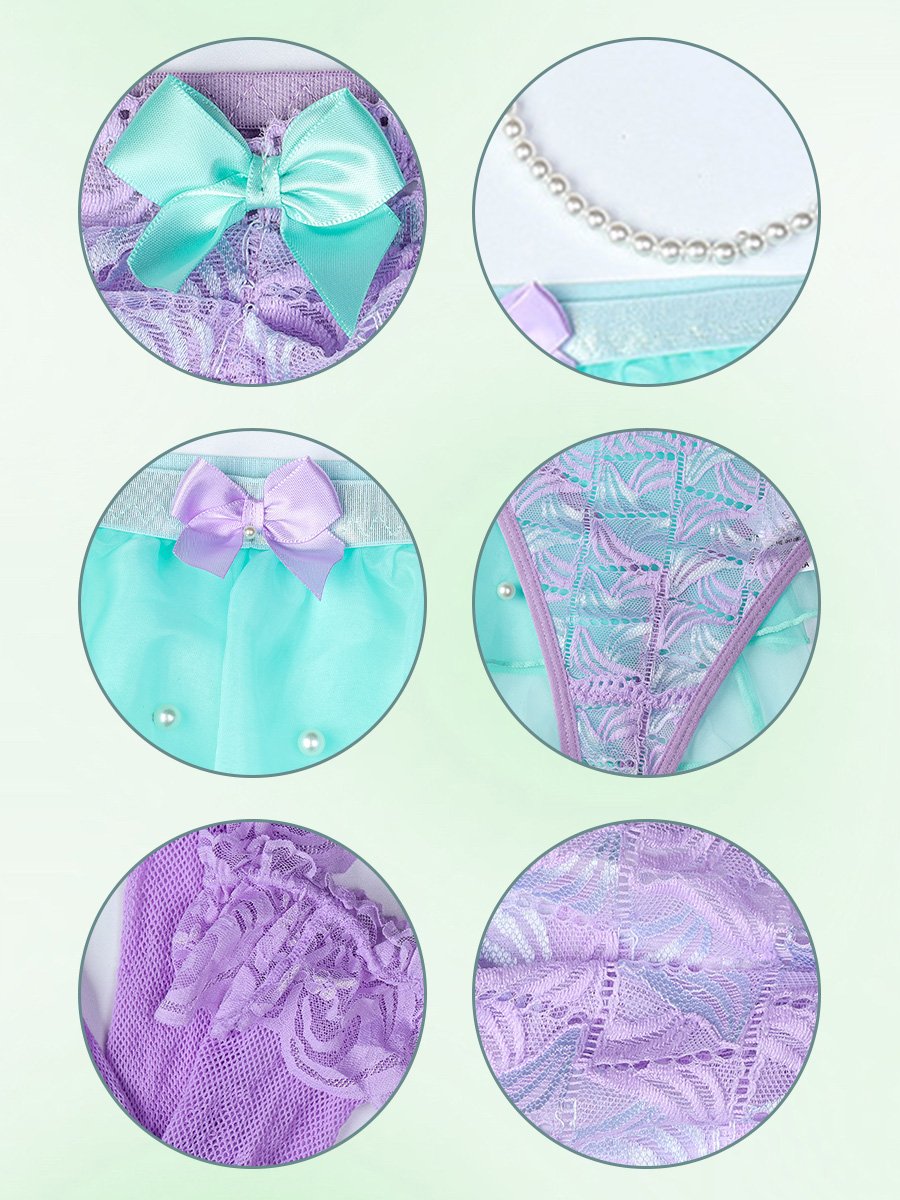 Design: This lace tube top set features a purple tube style bandeau, a satin bow accents, pearl chains underbust, and a matching panty. The included double mesh tiered skirt will flatter your legs and complete the look. Embrace your feminine side and turn heads with this beautiful lingerie set.