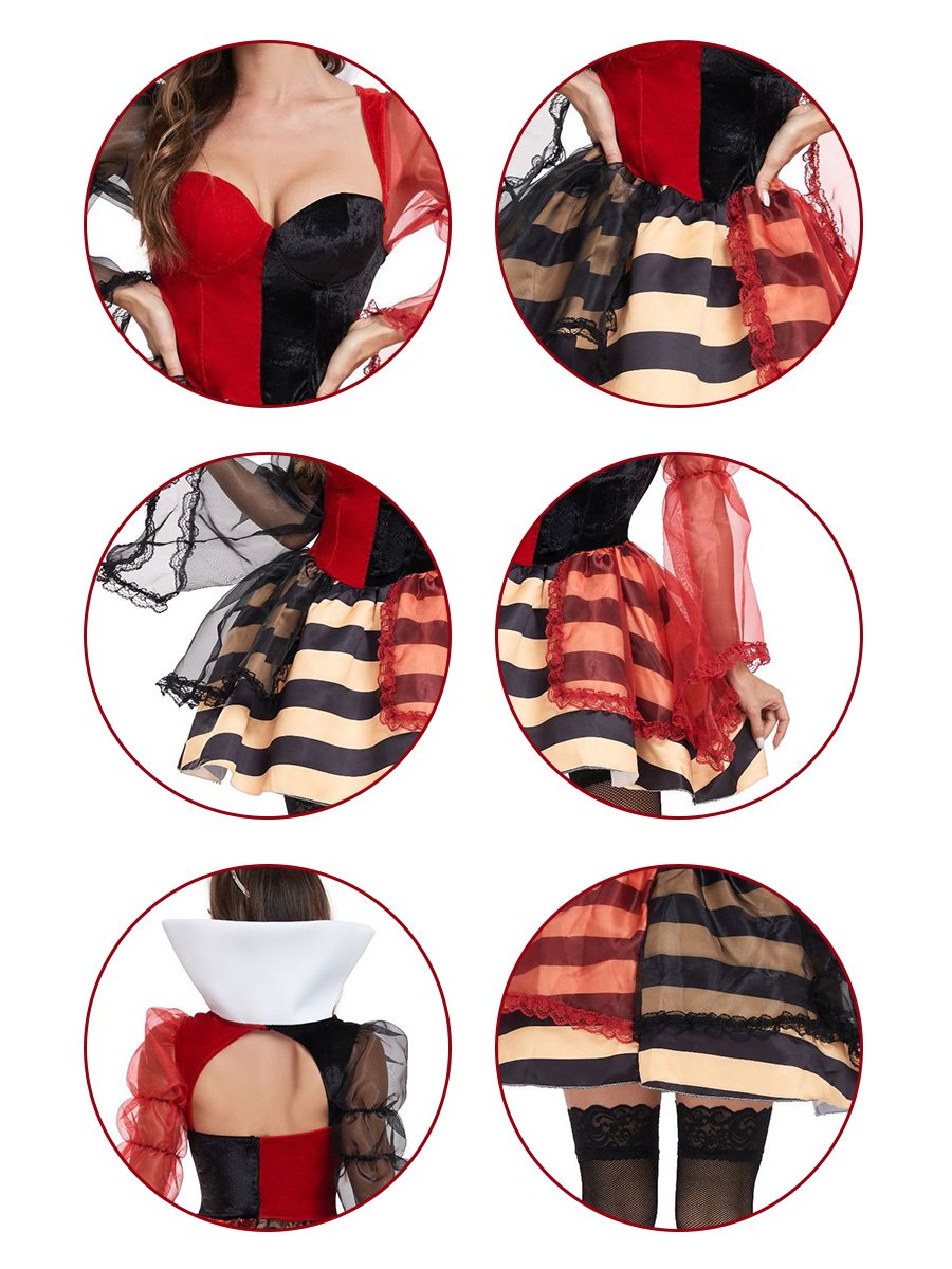 Design: Yomorio Royal Queen Costume featuring a black and red mini dress with stay up collar, a heart shaped neckline, sheer mesh long sleeves, and a striped skirt with a sheer mesh bustle, provides an alluring and seductive look.