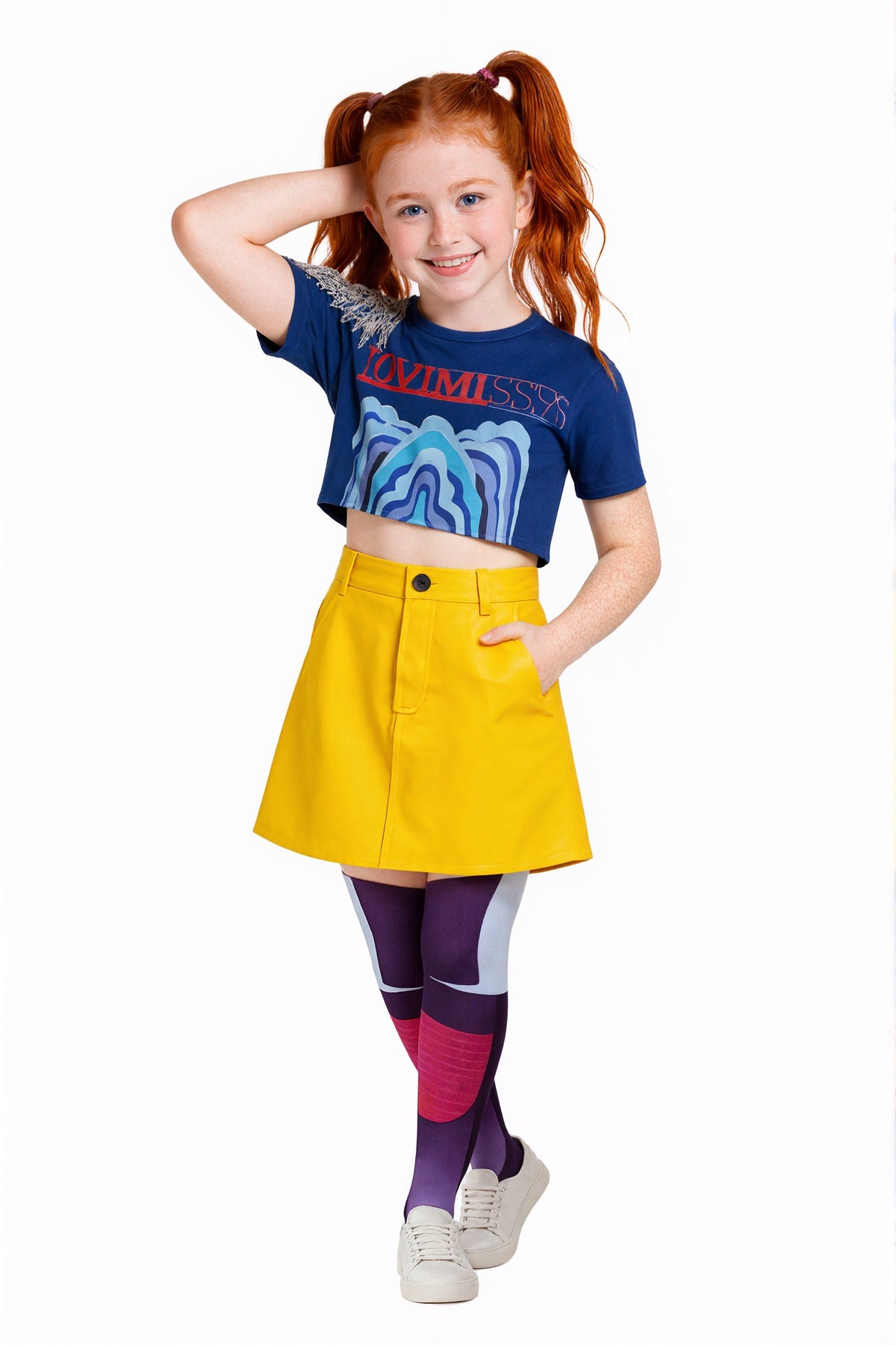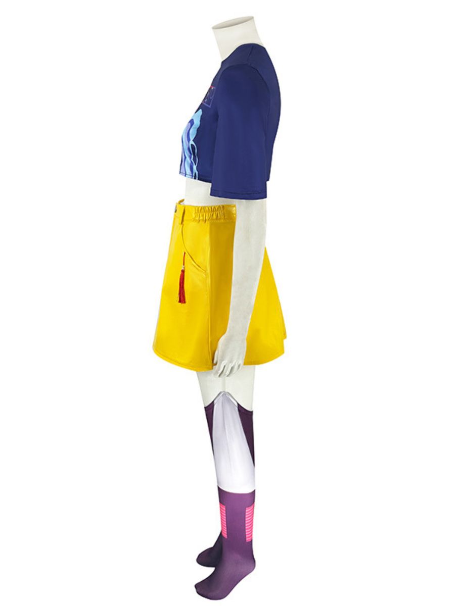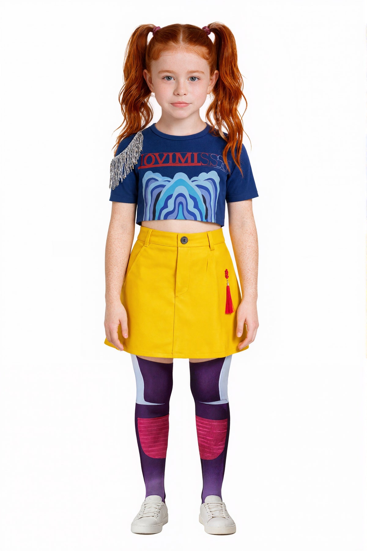 Design: Anime Girls Super Idol Costume featuring a black crop top with a vivid graphic print, rhinestone shoulder fringe, a vibrant yellow skirt adorned with a silver chain and red chinese-style tassel, restores the roles character.