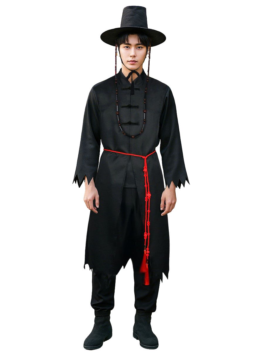Design: Anime Devil Hunter Costume featuring a black long-sleeve top with jagged edges, a black long vest for layered effect, a loose-fit pants, and a matching Korean-style wide-brimmed hat with hanging beads. restores the roles character.