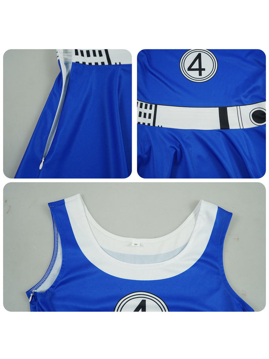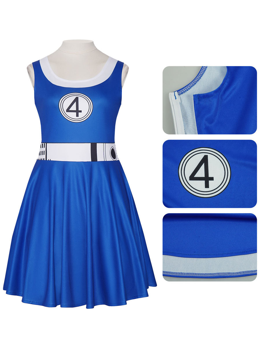 Design: Heroine Role-playing Cosplay Costume featuring a blue skater dress, the signature “4” emblem and a printed utility belt, this sleeveless dress blends comic book flair with everyday comfort, restores the roles character.
