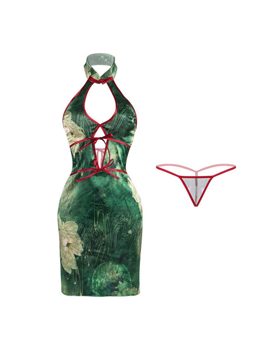 Design: Sexy Chinese Cheongsam Lingerie is designed with green mini dress with floral print, traditional chinese collar, an open back with a tie closure. No restraints on chest with narrow bralette design, and the mini dress are definitely fit on your body curves outline. It makes you more attractive, charming, fashion and chic.