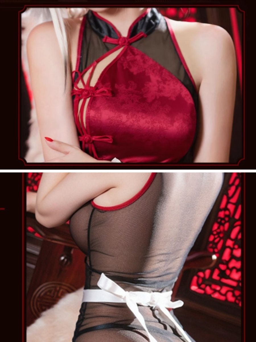 Design: Sexy Chinese Style Maid Lingerie Set is designed a high-neck cheongsam dress, red satin jacquard and sheer mesh panels for a provocative twist. A mini ruffled apron, and detachable bow cuffs complete the cosplay-ready look.