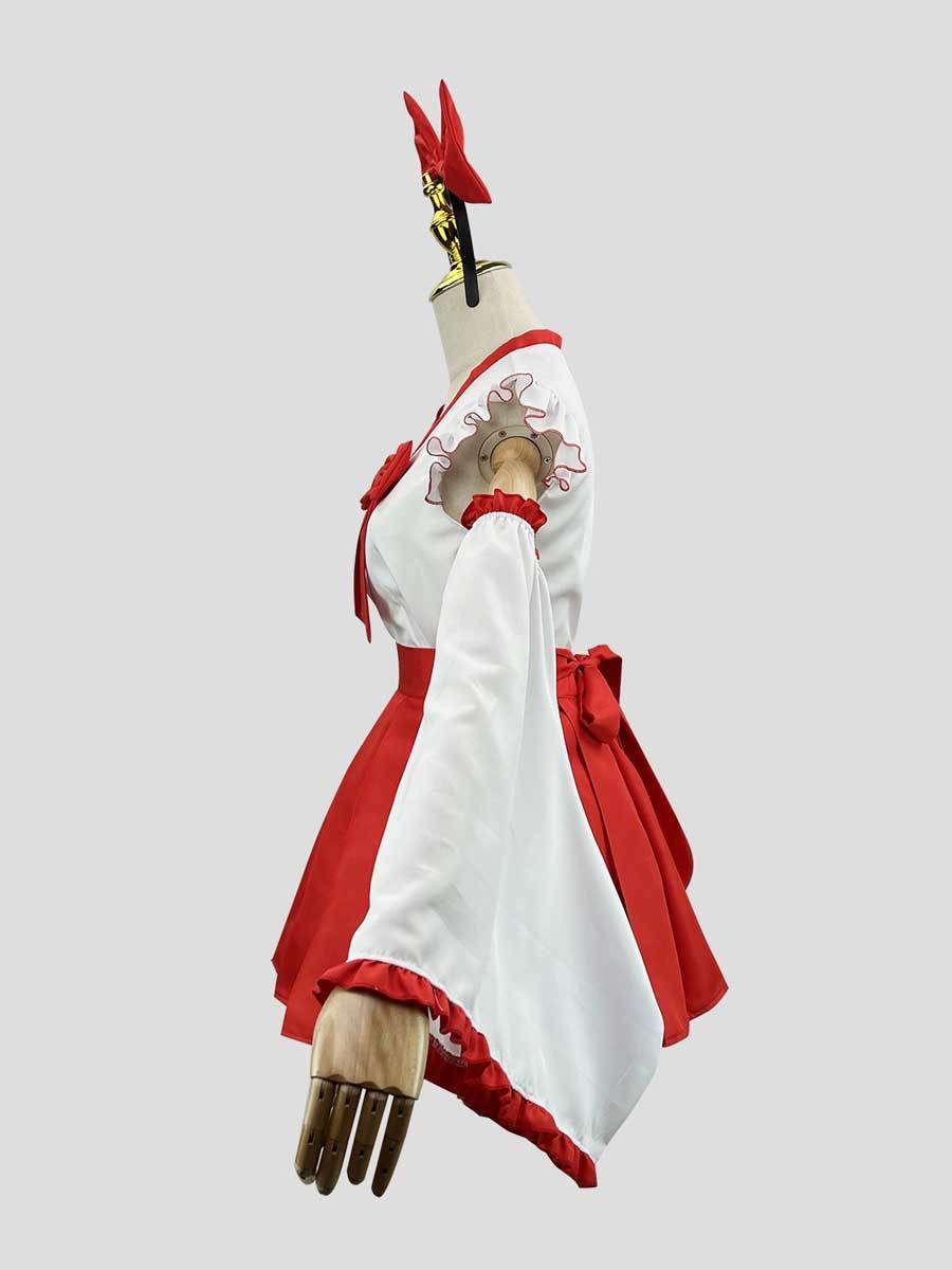 Design: The red mini skirt and white kimono top has been traditional for the Shrine Maiden. White kimono top with the red detailing features cold shoulder, red ruffled trim, long flared sleeve, and a matching pleated mini skirt will make you sexy, cute and attractive.