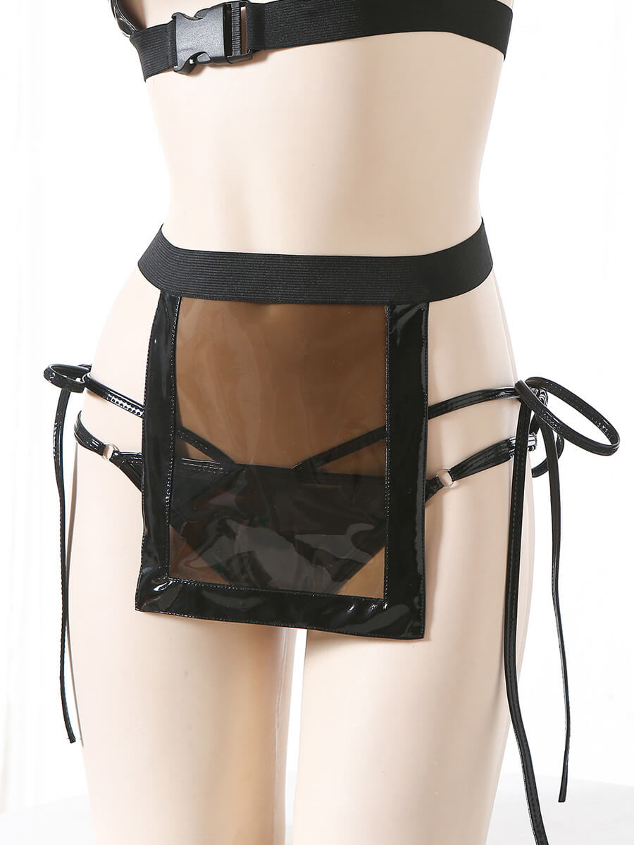 Design: Sexy leather succubus lingerie features: faux leather neck ring chain connection, crop top with halter neckline and front keyhole design, very special dark gothic outfit. A matching sheer apron skirt and leather panty with sides double straps closure, this is a cute and sexy costume designed to make you look more charming.