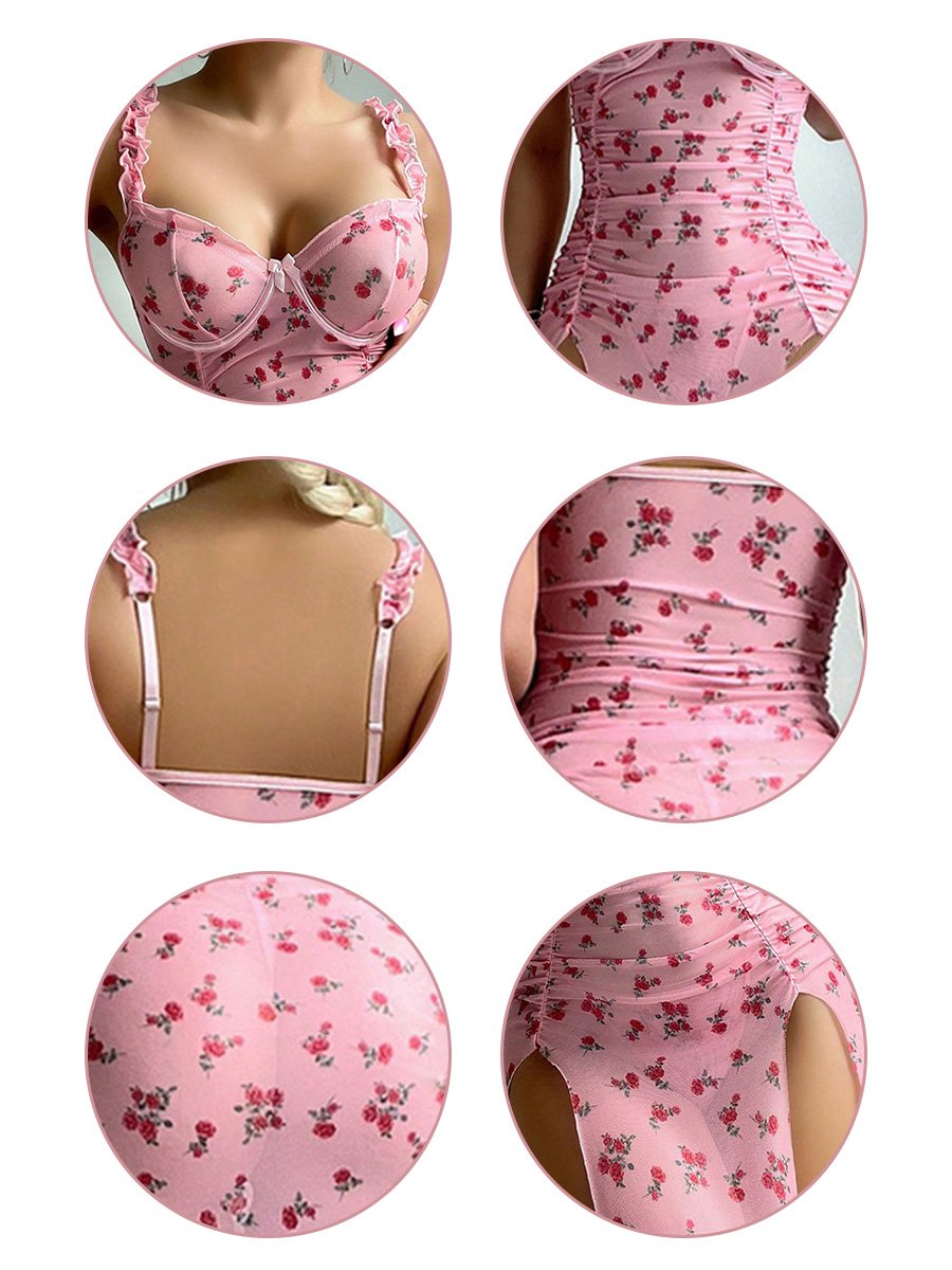 Design: This elegant babydoll dress features adjustable shoulder straps, an allover floral print, and a high slit hemline.