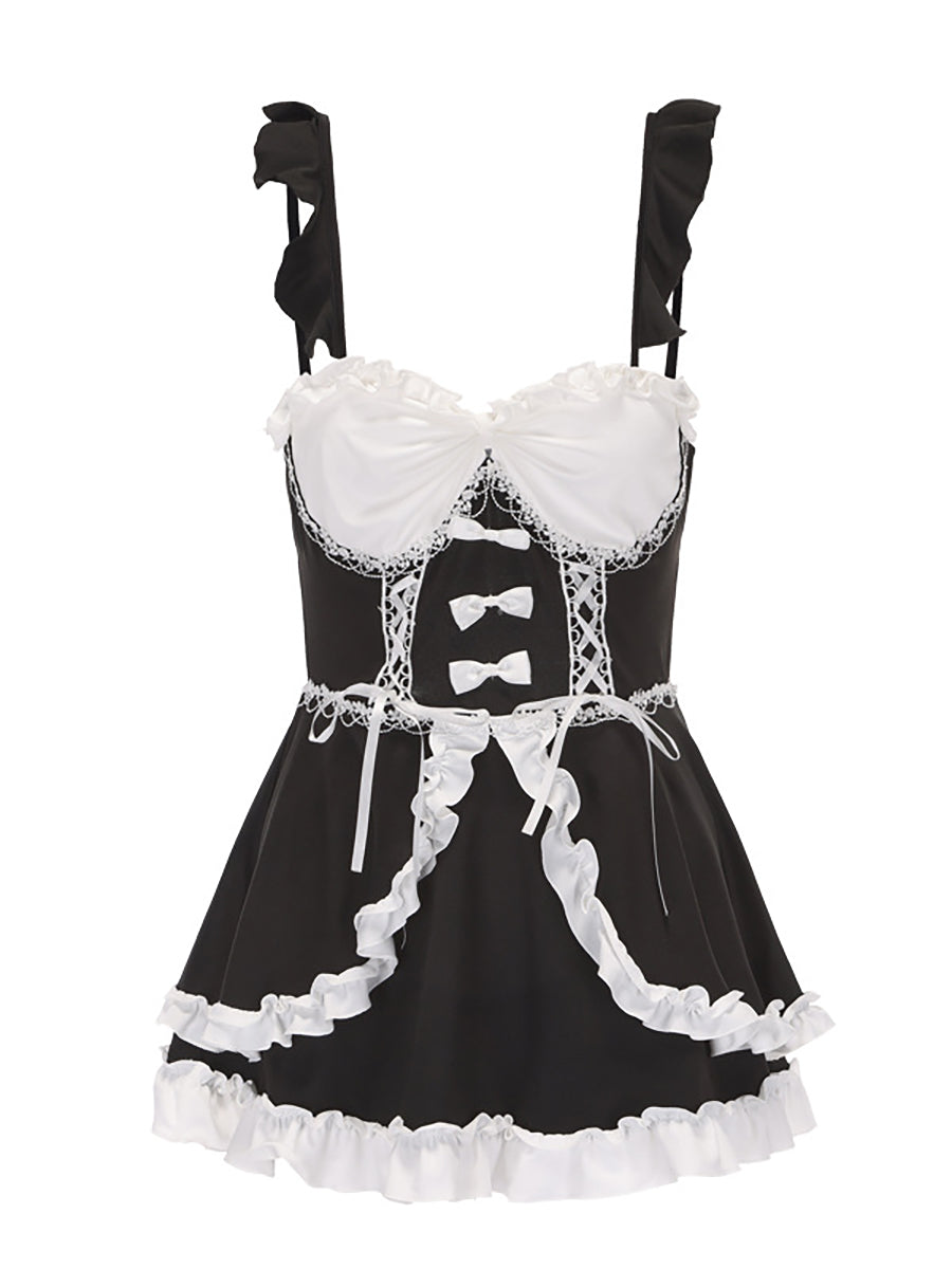 Design: Yomorio sexy maid costume featuring a black mini dress with contrasting white ruffle trim, delicate lace accents, adjustable spaghetti straps, a hook and eye back closure, and an attached apron overlay for that classic cosplay look.