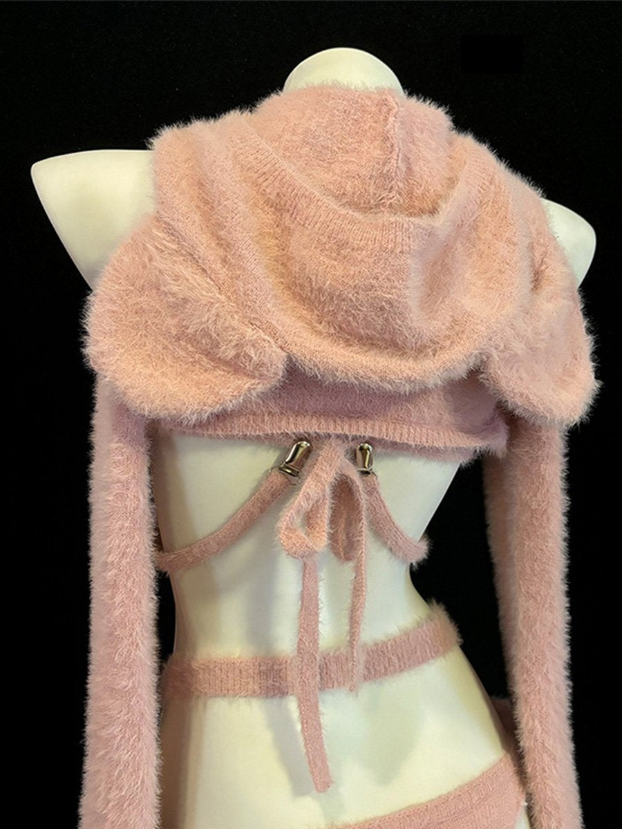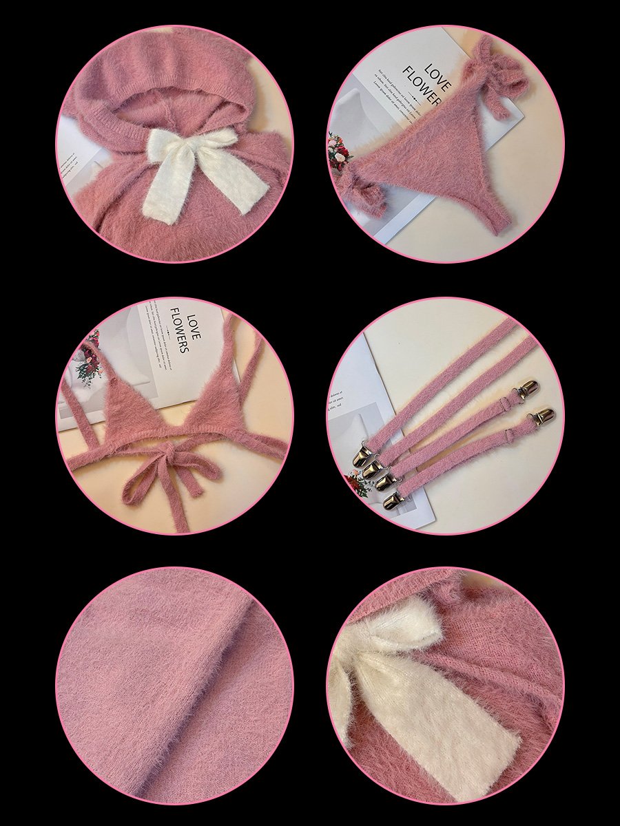 Design: Yomorio Sexy Faux Fur Bear Cosplay Lingerie show your perfect body curve. Long sleeves crop top with hooded, a top with triangle cups, a strappy underbust with a tie closure, adjustable garter straps, Complete the look with matching furry leg warmers and a thong cut panty with side tie closures for a touch of playfulness.