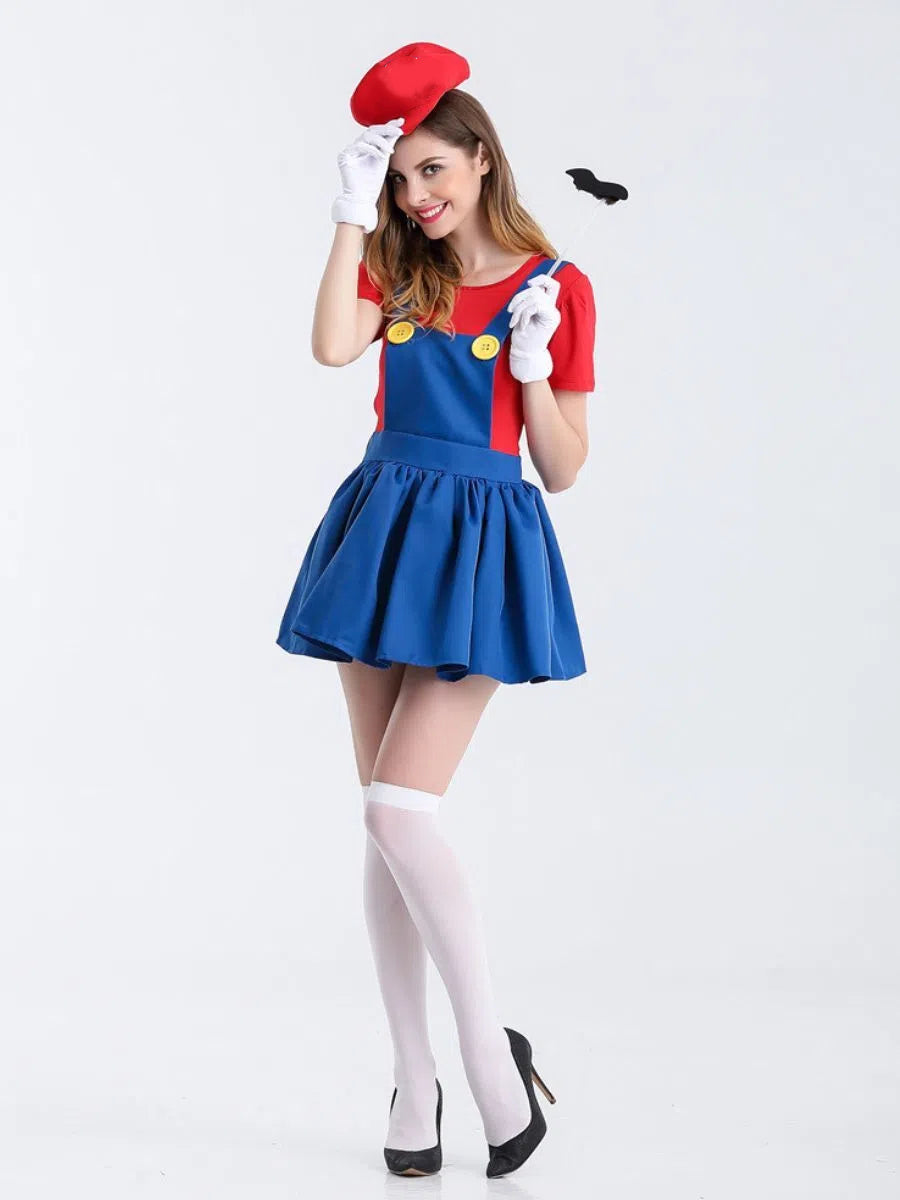Design: Game Plumber Costume featuring a vibrant short sleeved top with a blue overall dress, signature yellow buttons, and a matching cap, a fun mustache prop, this outfit is full of fun and nostalgic charm.