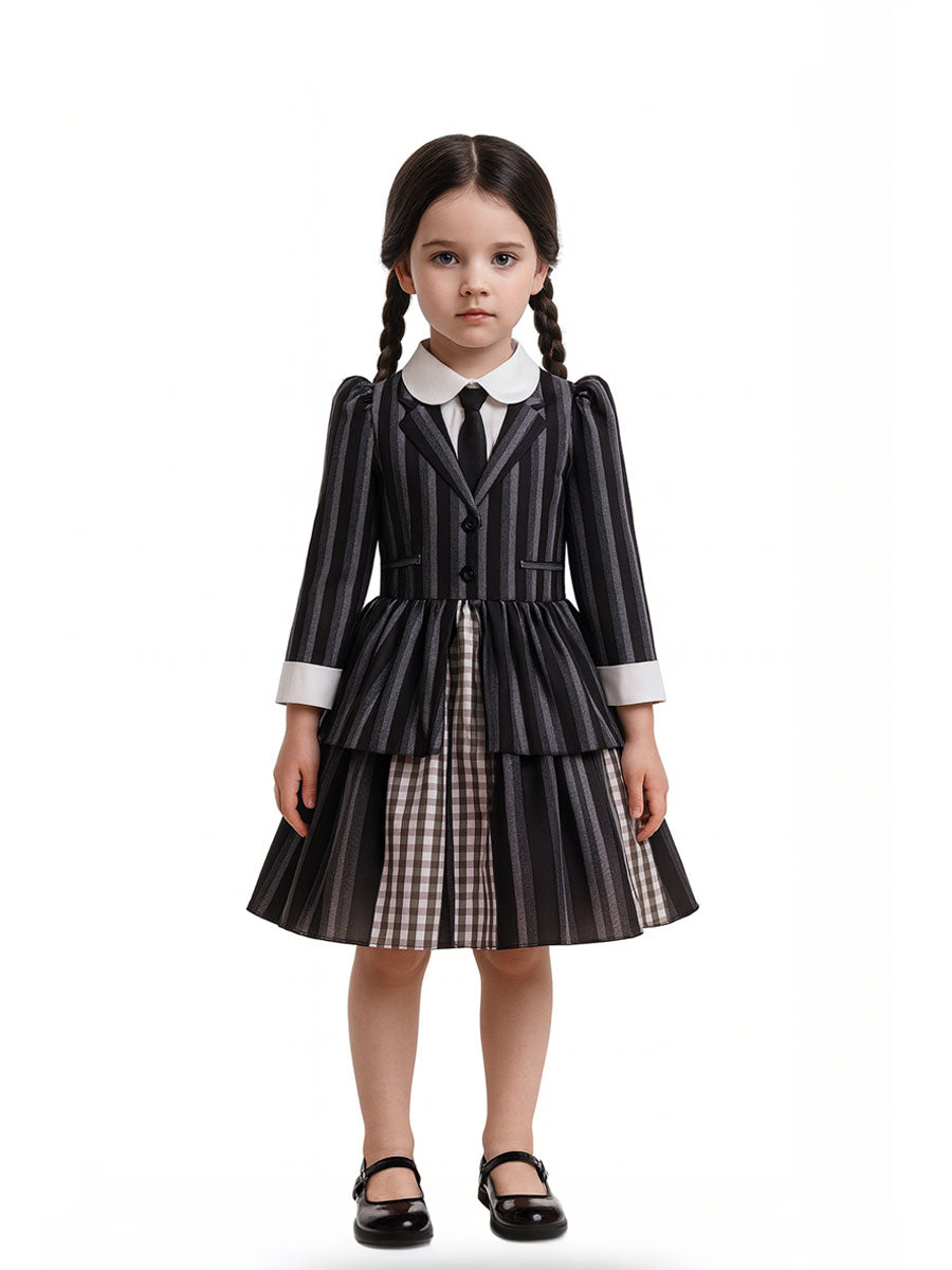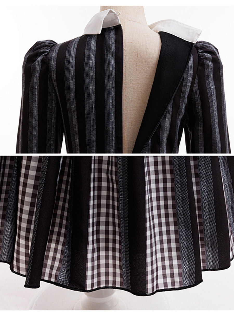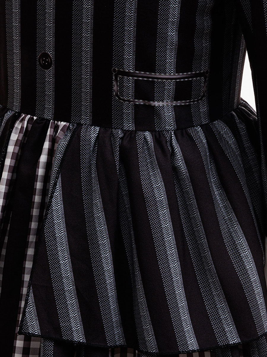 Design: This gothic-style dress features bold vertical stripes, a structured collar, and the layered skirt combines checkered and striped patterns, adding depth and drama to the outfit, restores the roles character.